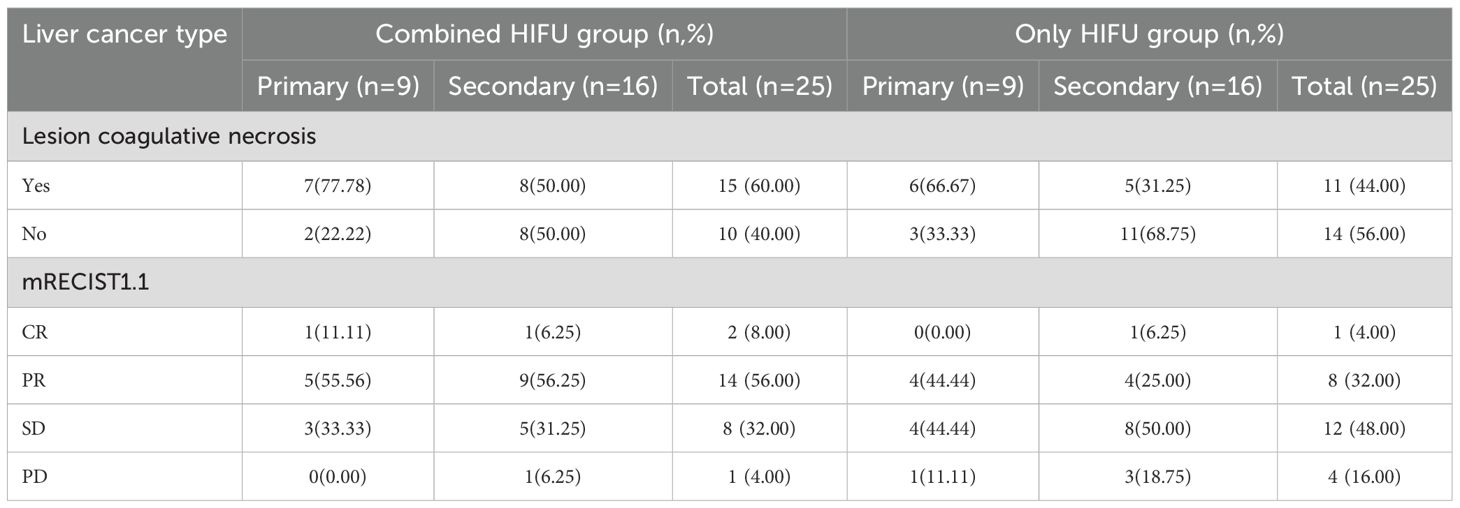 the objective response rate (ORR), as assessed by the investigators, was determined in accordance with the modified Response Evaluation Criteria in Solid Tumors version 1.1 (mRECIST 1.1). ORR was defined as the composite of complete remission (CR) and partial remission (PR) of the tumor following treatment. The details were as follows: complete response (CR): complete coagulative necrosis of the target lesion; partial response (PR): the longest diameter of the coagulated necrosis area of the target lesion was ≥ 30% of the baseline; stable disease (SD): no PR and no PD; disease progression (PD): no coagulative necrosis of the target lesion and at least a 20% increase in the longest diameter.