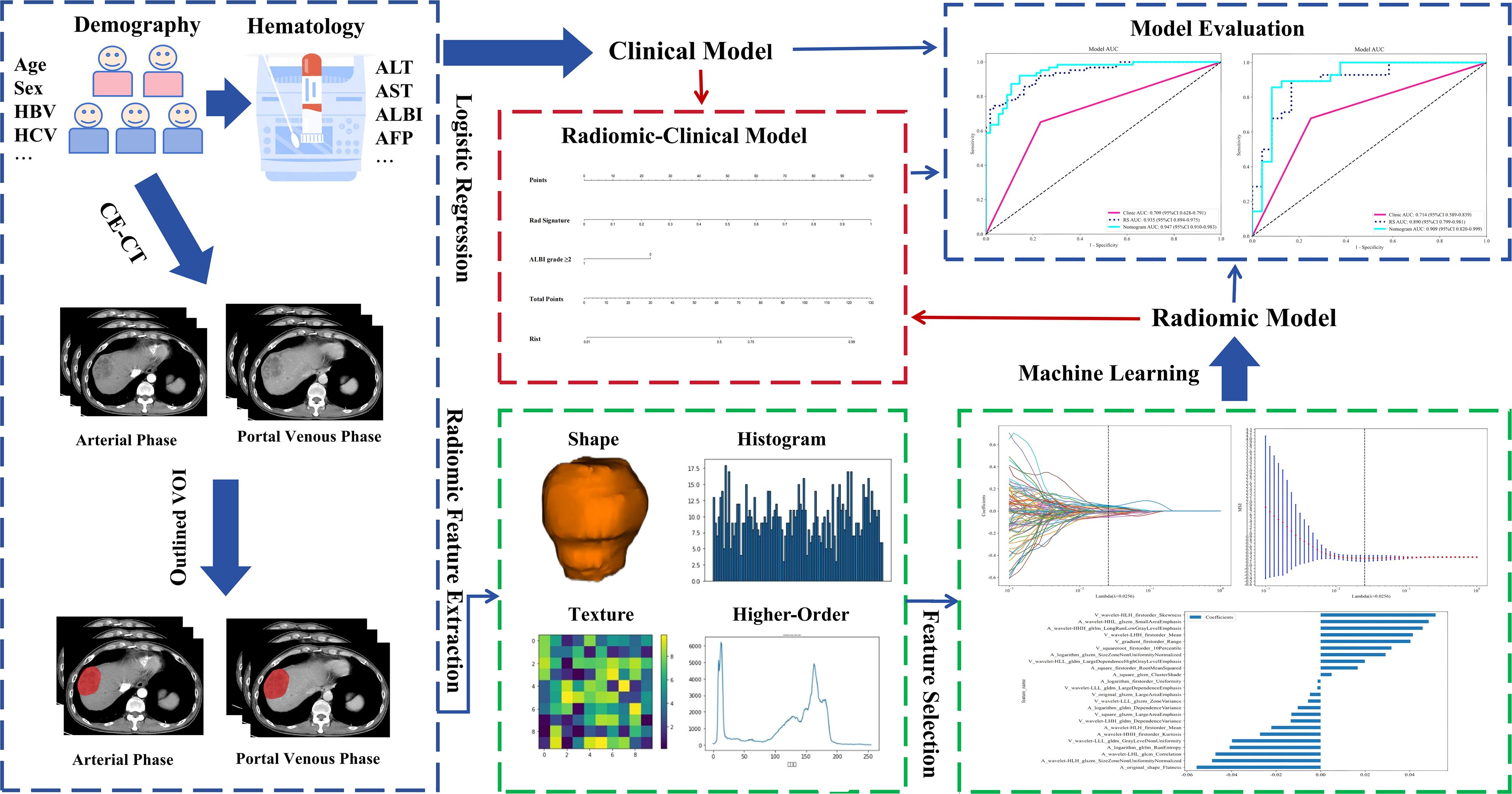 Figure 1. Workflow for development of the clinical-radiomics model. HBV, hepatitis B virus; HCV, hepatitis C virus; ALT, alanine aminotransferase; AST, aspartate aminotransferase; AFP, alpha-fetoprotein; CE-CT, contrast-enhanced computed tomography; VOI, volume of interest; ALBI, albumin-bilirubin; RS, Rad Signature.