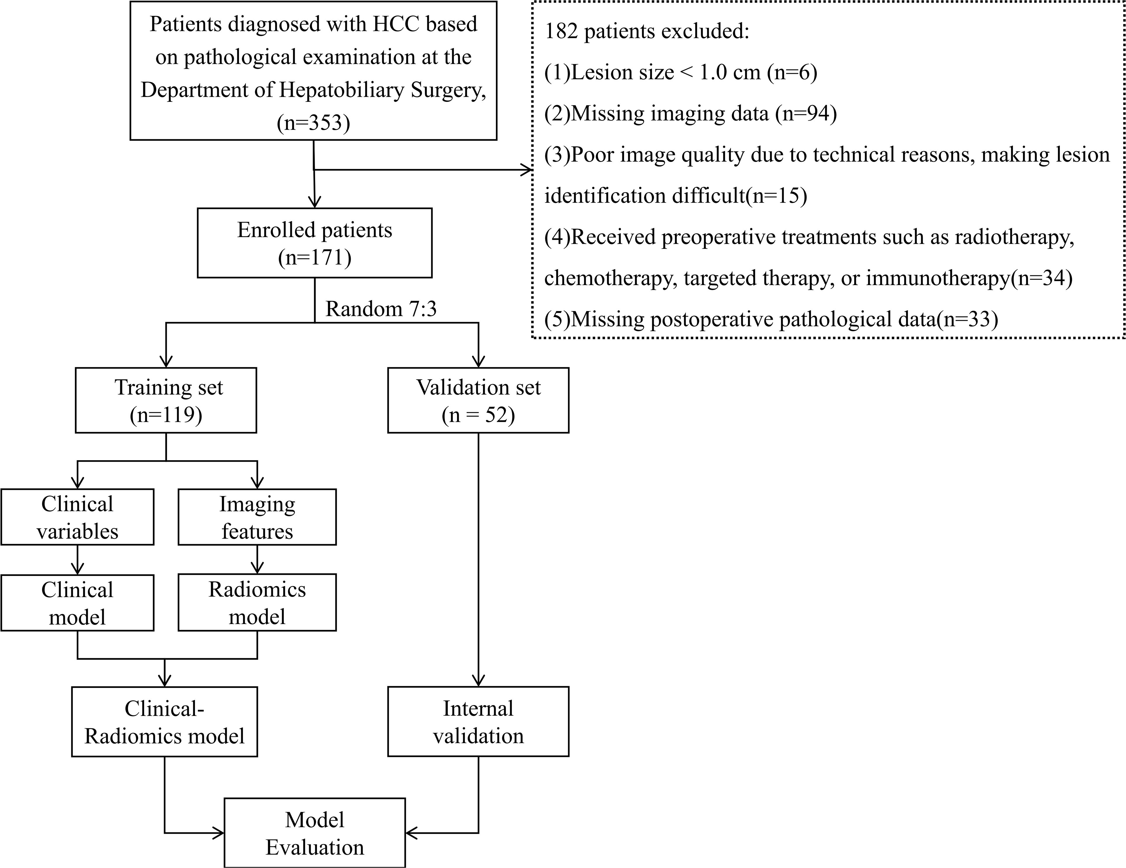 The Ethics Committee of Northern Theater General Hospital approved this retrospective study conducted at a single center (Ethics No: Y(2024)028). Between 2017 and 2024, 353 consecutive HCC patients who underwent surgical treatment at the Hepatobiliary Surgery Department of Northern Theater General Hospital were included. The inclusion criteria were: (1) a confirmed postoperative pathological diagnosis of HCC; and (2) contrast-enhanced CT of the liver performed within 1 month before surgery. The exclusion criteria were: (1) lesion size <1.0 cm; (2) missing imaging or clinical data; (3) poor image quality that hindered lesion identification; (4) history of preoperative treatments such as radiotherapy, chemotherapy, targeted therapy, or immunotherapy; and (5) missing postoperative pathological data (Figure 2). After applying the inclusion and exclusion criteria.