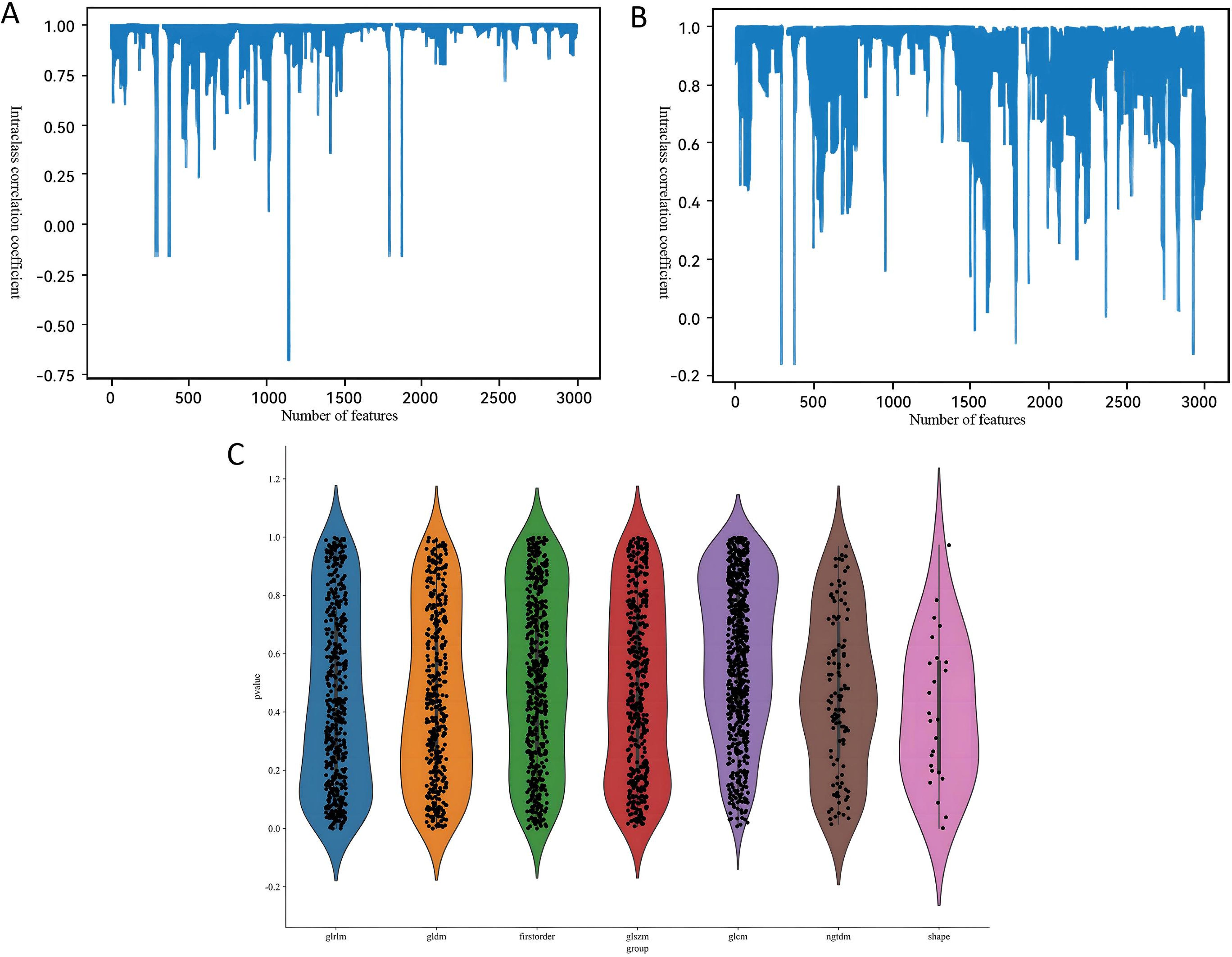 Figure 3. Bar charts of the intraclass correlation coefficient for (A) intra- and (B) inter-observer reliability. (C) Statistical plot of radiomic features.
