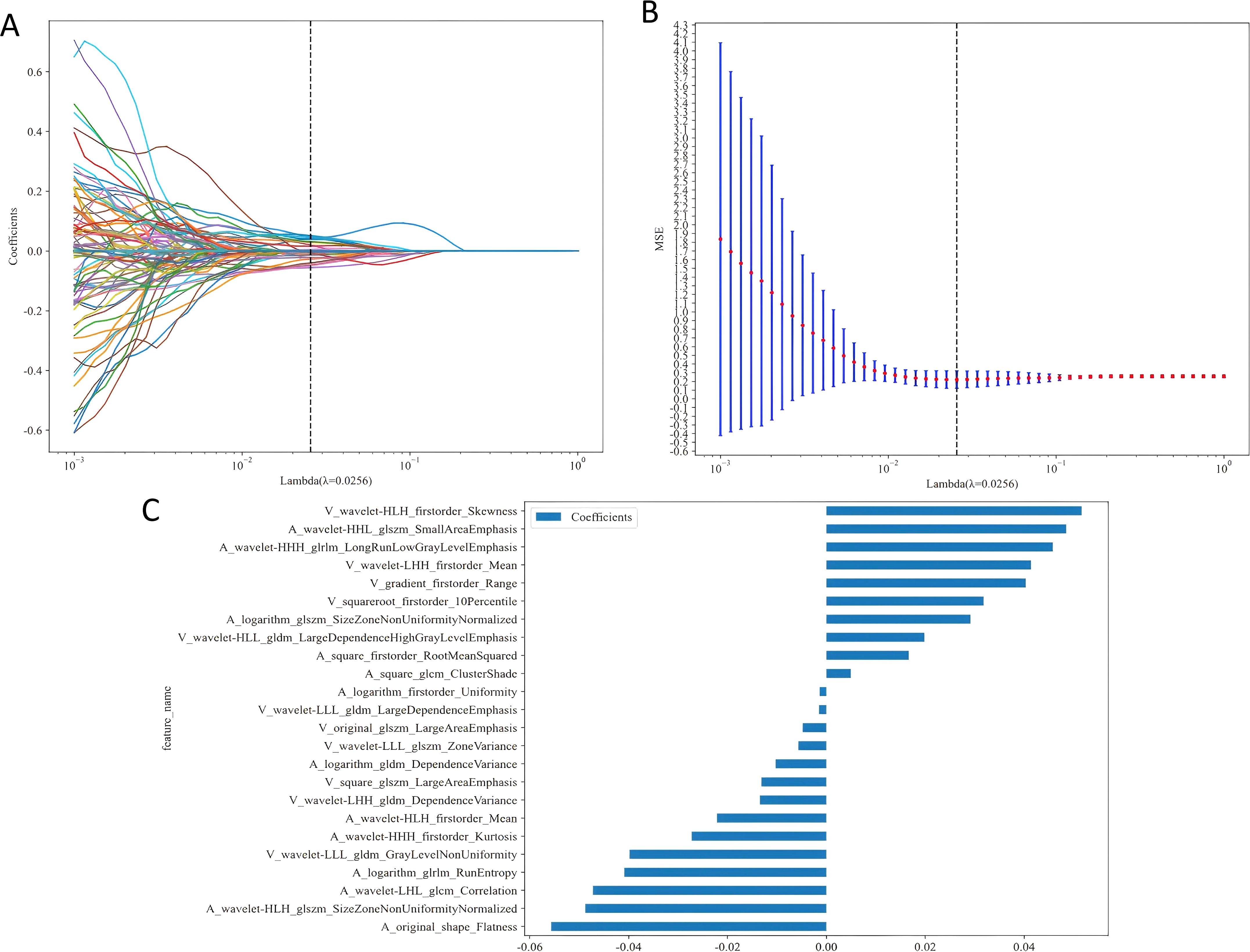 Figure 4. (A) Distribution of LASSO coefficients for each radiomic feature. (B) Optimal penalty coefficient (λ) for the LASSO model, determined via 10-fold cross-validation and the 1-SE rule. (C) Histogram of selected feature coefficients. 1-SE, One Standard Error.