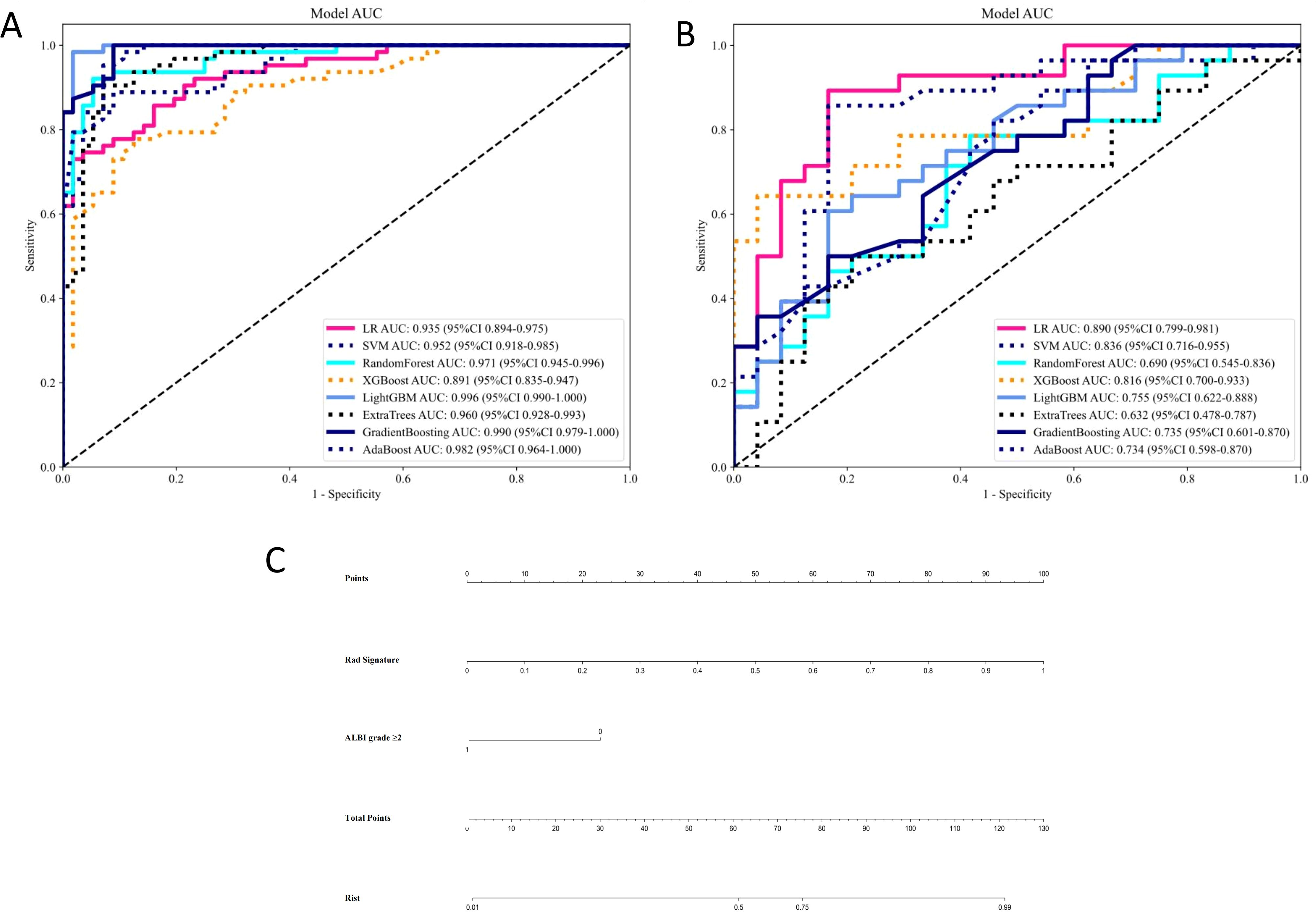 Figure 5. Receiver operating characteristic curves of eight machine learning-based radiomics models for predicting intratumoral tertiary lymphoid structures for the (A) training and (B) validation sets. (C) Nomogram combining albumin-bilirubin score ≥2 and Rad Signature. LR, logistic regression; SVM, support vector machine; XGBoost, eXtreme Gradient Boosting; LightGBM, Light Gradient Boosting Machine; AdaBoost, Adaptive Boosting.