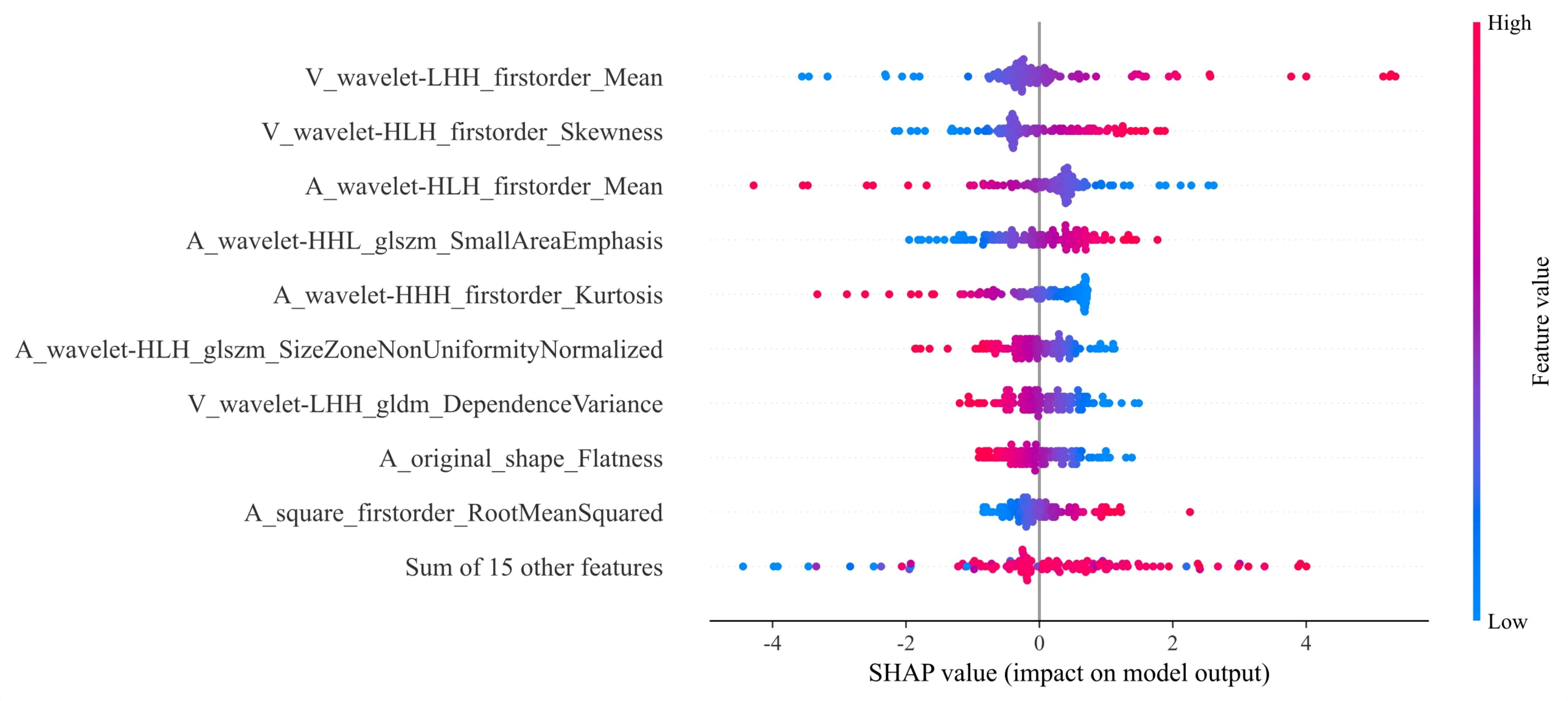 After evaluating multiple machine learning-derived radiomics models, the highest-performing model was enhanced by incorporating independent prognostic factors to develop a combined model. The predictive model’s calibration was assessed through (1) the generation of calibration curves comparing predicted values with actual TLSs expression, and (2) the computation of SHAP values to explain feature contributions. The model’s goodness of fit was evaluated using the Hosmer-Lemeshow test. Clinical applicability was assessed via decision curve analysis (DCA).