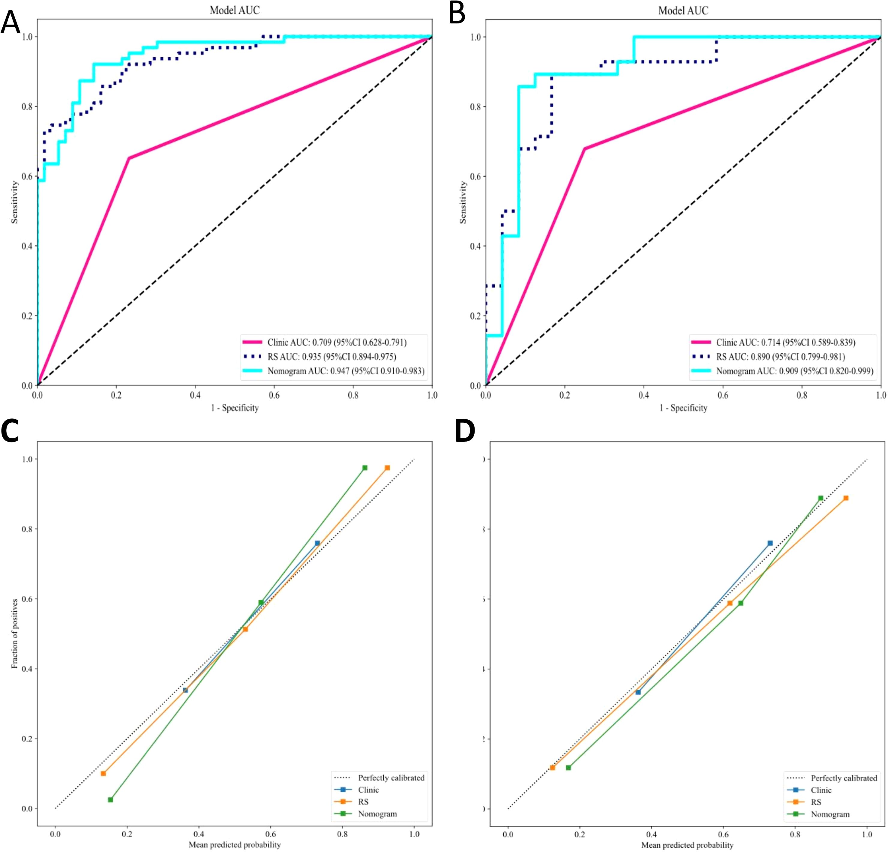 Figure 7. ROC and calibration curves for the clinical, radiomics, and combined models. (A) ROC curves for the (A) training and (B) validation sets. Calibration curves for the nomograms in the (C) training and (D) validation sets. ROC, receiver operating characteristic; RS, Rad Signature.