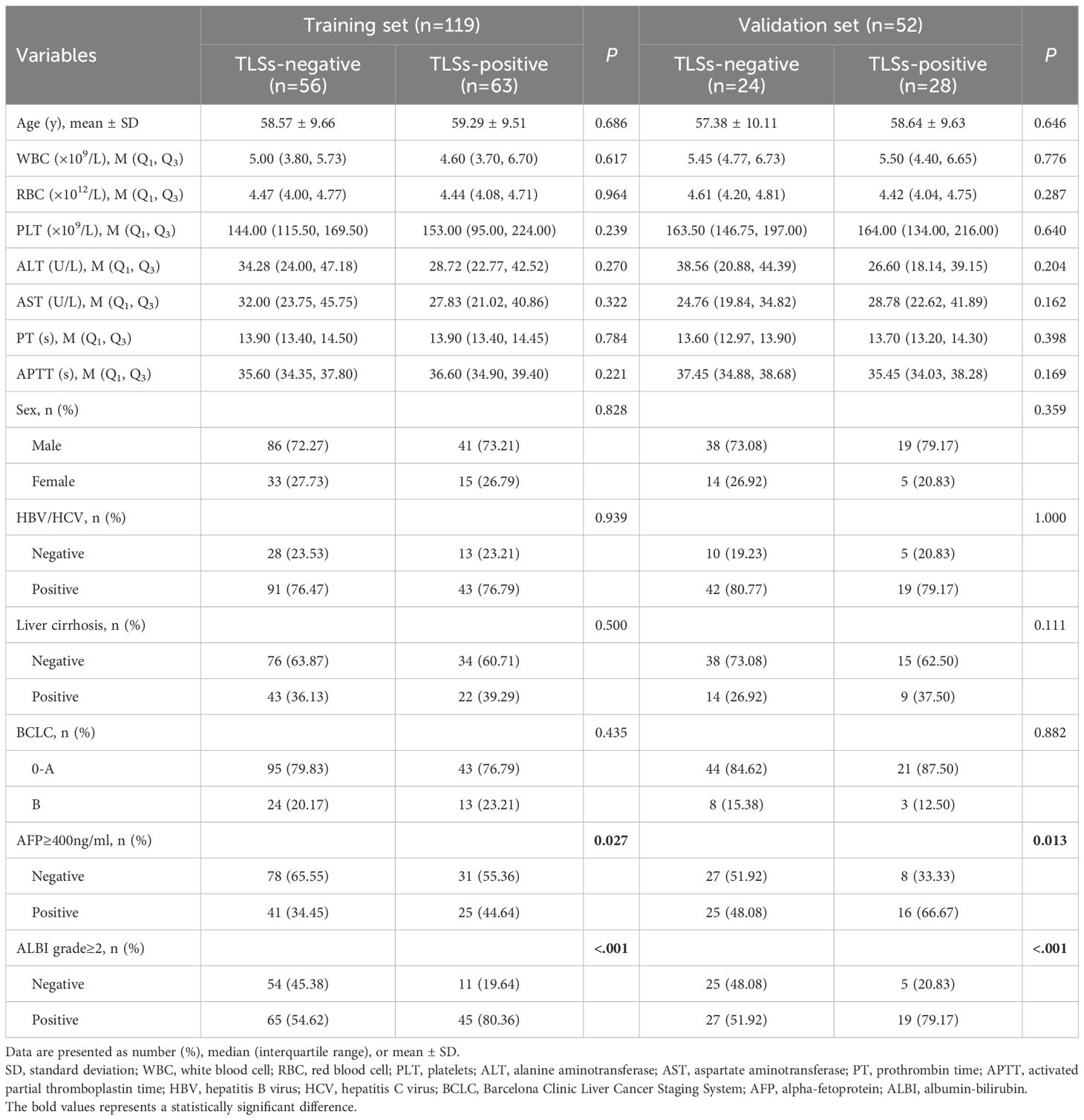 The study included 171 HCC patients, with 119 (69.6%) in the training set and 52 (30.4%) in the validation set. The prevalence of intratumoral TLSs was balanced between the two sets, with 52.94% (63/119) TLSs-positive cases in the training set and 53.85% (28/52) in the validation set (P = 0.914 for inter-set difference).