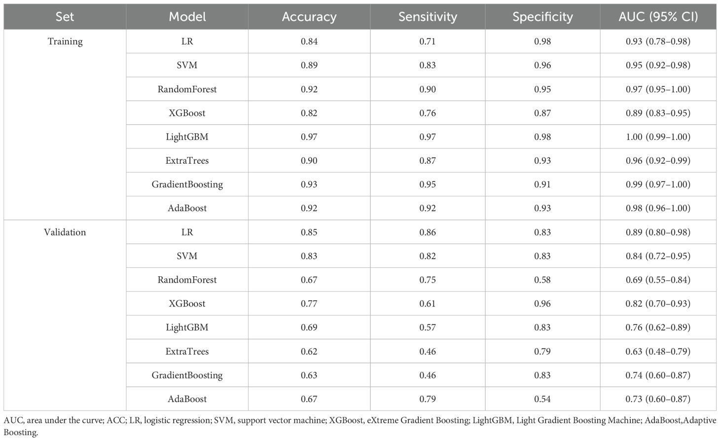 Table 2. Diagnostic performance of eight machine learning models in the training and validation sets.