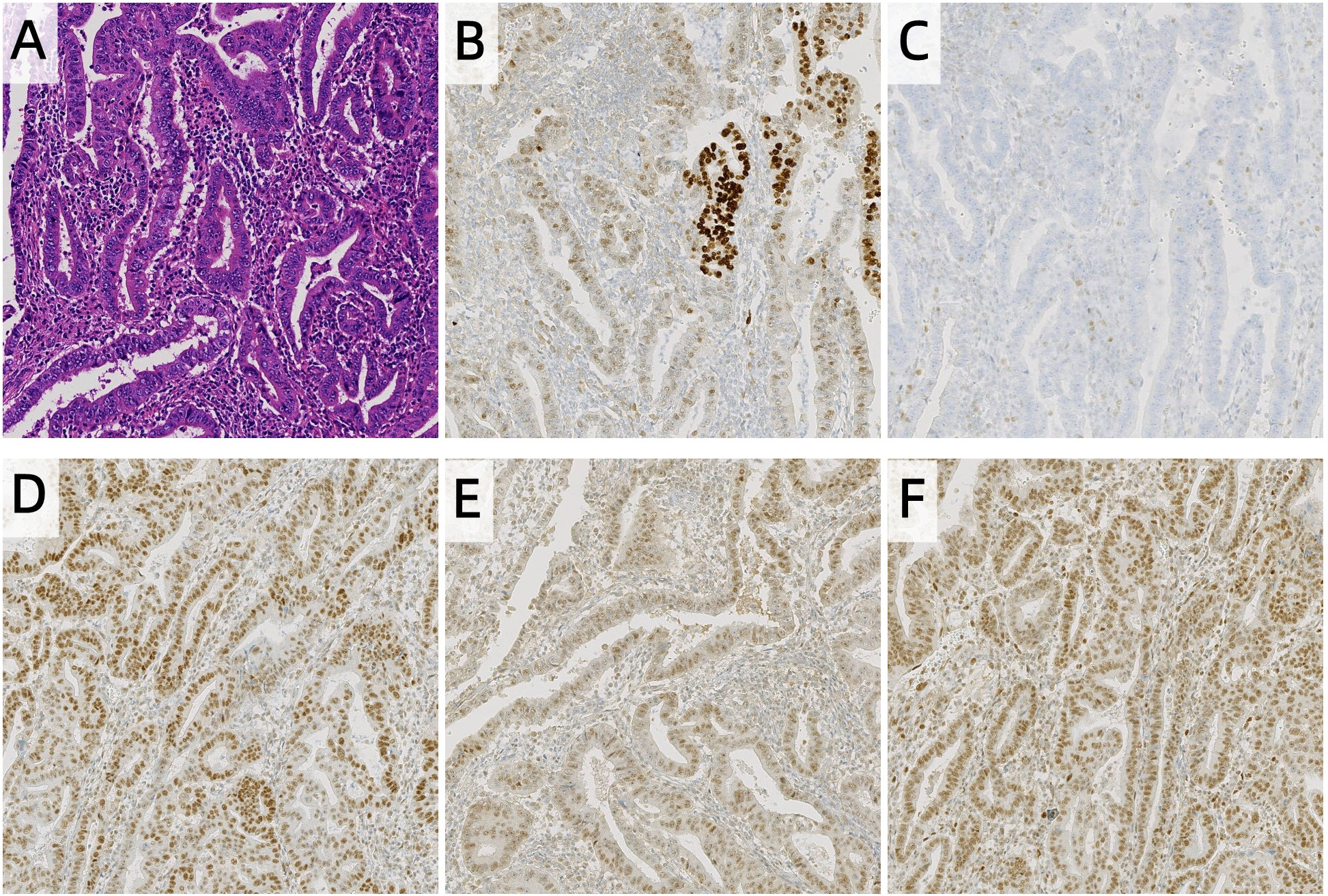 Histopathology and Immunohistochemistry of endometrial carcinoma, (A) HE, (B) p53, (C) MSH6, (D) MLH1, (E) PMS2, (F) MSH2 (100 ×). The expression of MSH6 in tumor cells is completely lost, while the interstitial blood vessels serve as a positive internal control. The p53 expression was heterogeneous, with 80% tumor region wild-type and 20% tumor region mutant subtypes.