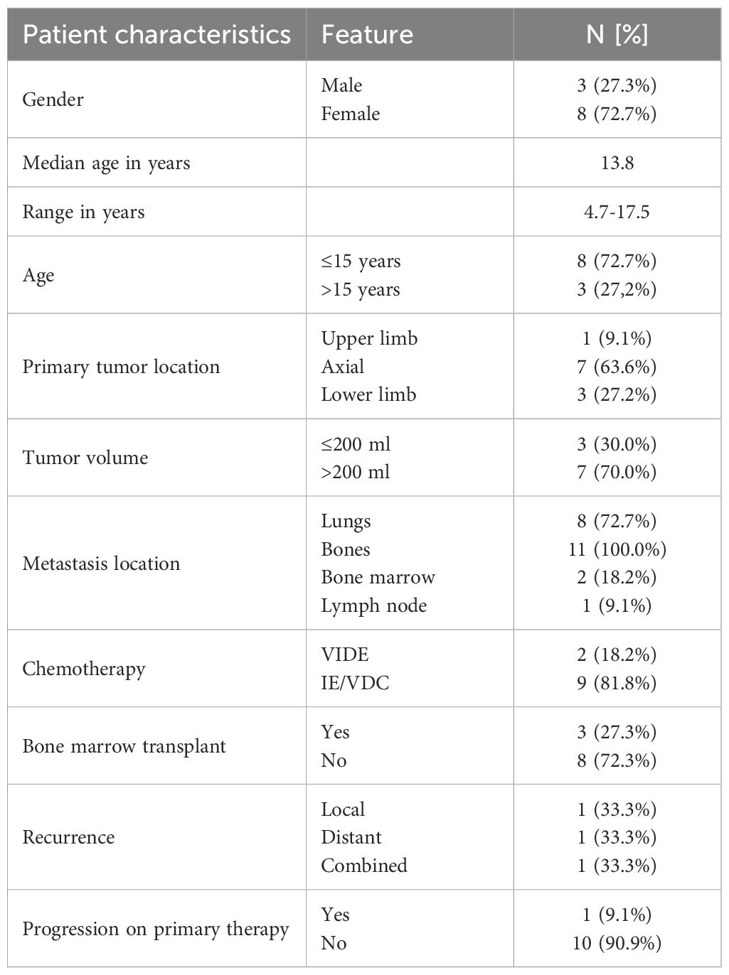 Between 2016 and 2024, 11 patients (8 female, 3 male) with primary multi-metastatic bone ES were referred for treatment to the Mother and Child Institute. The patient clinical and treatment characteristics are shown in Table 1. The median age at the time of diagnosis was 13.8 years (range 4.7 to 17.5 years); Eight patients (72.7%) were ≤ 15 years at the time of diagnosis. The most common primary site was the axial location. Eleven (100.0%) patients had metastasis to other bones only, two (18.2%) had bone marrow metastases, and eight (72.7%) had additional lung metastases. All patients received the first-line treatment (VIDE or VDC/IE regimen) parallel with oral pazopanib. Ten (90.9%) patients received concurrent radiation therapy. The primary tumor was operated on in five (45.5%) patients. Five of the five patients (100%) undergoing surgery achieved negative resection margins. Poor histological response was found in one patient (20.0%). Two (25%) patients with lung disease underwent thoracotomy after neoadjuvant chemotherapy, and seven (87.5%) of them subsequently received whole lung radiation therapy. Pazopanib was administered on average 1.7 years (range 0.9 to 5.1).