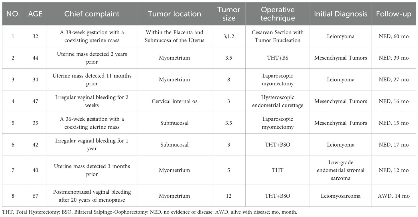 We analyzed 8 cases of IMT with unusual features. The clinical data were summarized in Table 1. The age of the patients ranged from 32 to 67 years, with a median age of 41 years and an average age of 42.7 years. Clinically, the main presenting symptoms included uterine mass and irregular vaginal bleeding. Among these, 3 cases were incidentally detected uterine masses during routine physical examination; 2 cases presented with uteroplacental masses during pregnancy; and the remaining 3 cases sought medical attention due to irregular vaginal bleeding. All patients were preoperatively diagnosed with “uterine space-occupying lesions” and underwent surgical resection. Surgical procedures included total hysterectomy with or without bilateral salpingo-oophorectomy in 4 cases, laparoscopic enucleation in 3 cases, and 1 case underwent dilatation and curettage based on endometrial assessment. Intraoperatively, tumors were observed as solitary or multifocal with size ranging from 1.2 to 12 cm, bearing variable demarcation from surrounding tissues (well-defined or infiltrative margins). Postoperatively, except for the patient with epithelioid inflammatory myofibroblastic sarcoma (EIMS), none of the other patients received any additional therapy.