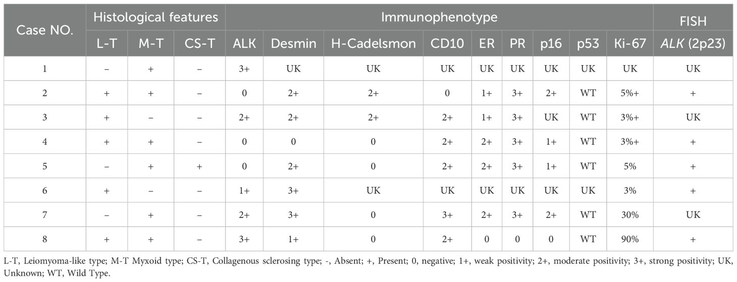 All specimens were fixed in 10% neutral-buffered formalin and then embedded in paraffin, Afterwards, they were cut into sections with a thickness of 4 μm for hematoxylin and eosin (H&E) staining. Histomorphology evaluation was performed under light microscopy. Immunohistochemical staining was carried out using a fully automated immunostainer. The primary antibodies and chemical reagents were obtained from Maixin Biotech (Fuzhou, China), including ALK (clone D5F3), SMA, desmin, caldesmon, p16, p53, estrogen receptor (ER), progesterone receptor (PR), CD10, and Ki-67.
