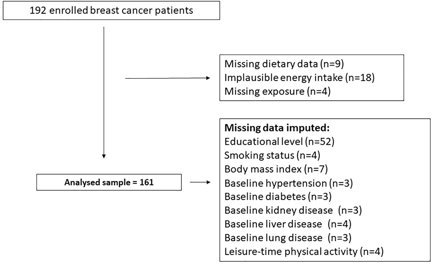 For the purposes of the present analyses, data from 161 women with BC who received radiotherapy were included. Comprehensive methodological details regarding the ATHENA randomized controlled trial (RCT) are available in previously published reports (19). Participants’ flow chart is provided in Figure 1.