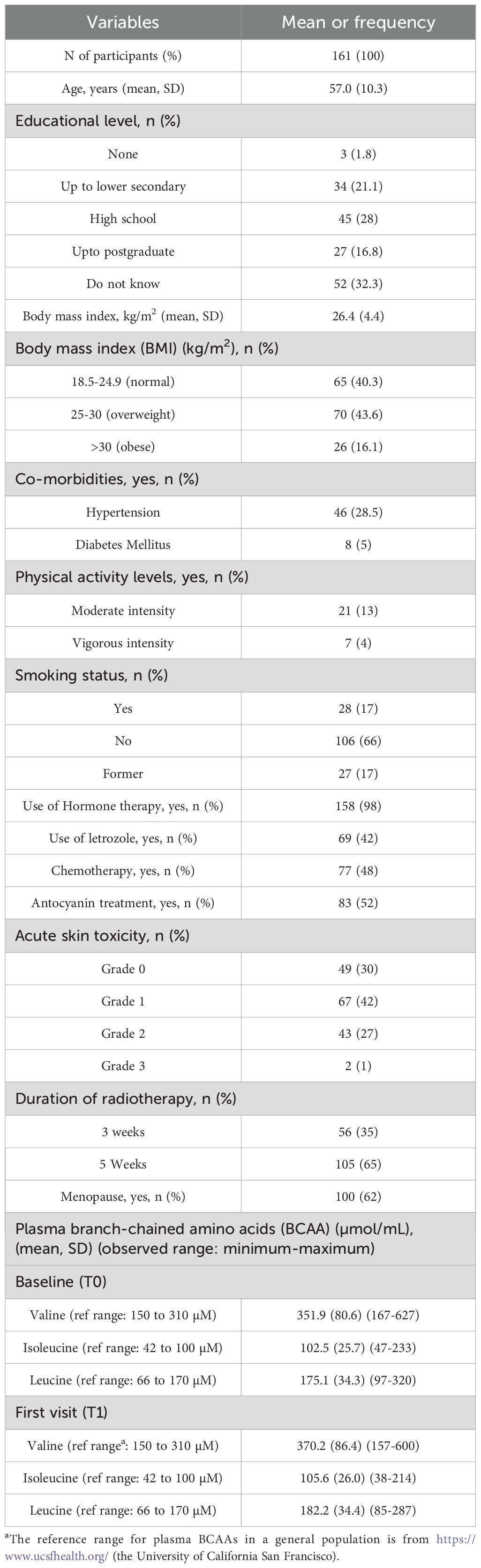 Studies have suggested that both higher dietary and elevated circulating BCAAs levels were associated with a lower severity of BC (16, 17) by suppressing tumor growth and metastasis (17, 18). Interestingly, there is sparse evidence on the influence of amino acids, especially BCAAs, on the risk of radiation-induced skin injury in cancer, specifically BC.