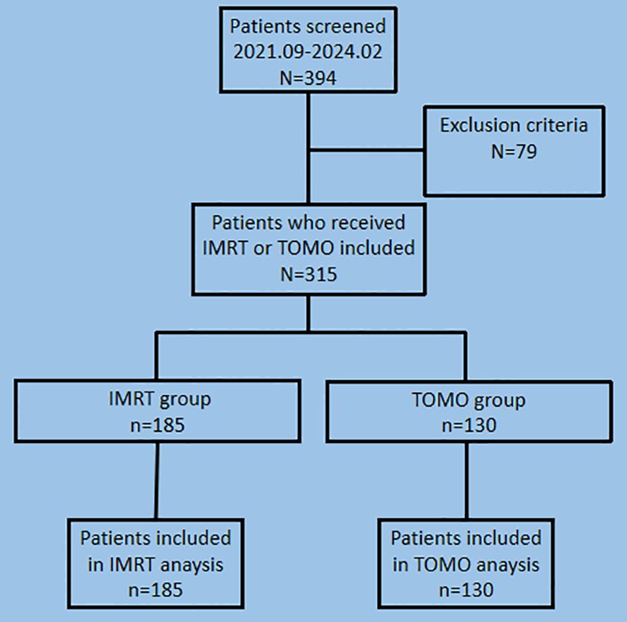 Between September 2021 and February 2024, 394 patients with early stage breast cancer who underwent lumpectomy or mastectomy were included in the primary analyses. After screening patients with the exclusion criteria, 79 patients were excluded, and 315 patients were enrolled in this study. The TOMO group and IMRT groups comprised 130 and 185 patients, respectively (Figure 1).