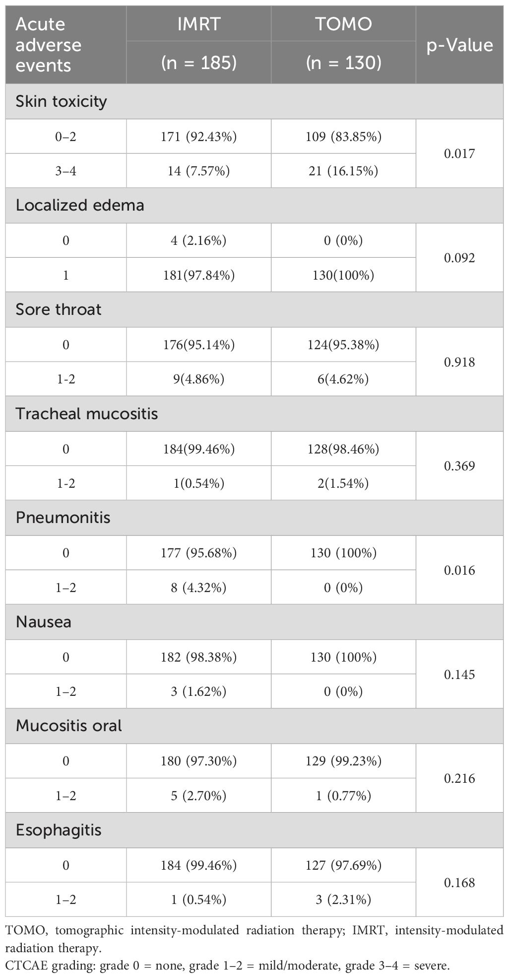 The clinical endpoint of this study was acute adverse events immediately following the completion of radiation therapy. Patients’ acute adverse events were prospectively recorded for a period of 3 months and were evaluated by medical oncologists, radiation oncologists and clinicians in accordance with the Common Terminology Criteria for Adverse Events (CTCAE) (Version 5.0) (19). In this study, acute adverse events were defined as those first observed and diagnosed within 90 days of the latest radiotherapy session. We recorded acute skin toxicity (erythema, epilation, desquamation, decreased sweating, edema, ulceration, hemorrhage, and necrosis), localized edema, sore throat, tracheal mucositis, nausea, oral mucositis, esophagitis, and pneumonitis. Adverse events were recorded weekly during TOMO or IMRT treatment and then repeated until 3 months after the last radiotherapy. Particularly, before the implementation of treatment, clinicians assessed the skin condition to ensure that the skin was clear, normal, and with out lesions. Patients were also excluded from the study if they had any risk factors (such as comorbidities or concurrent medications) for vulnerable skin.