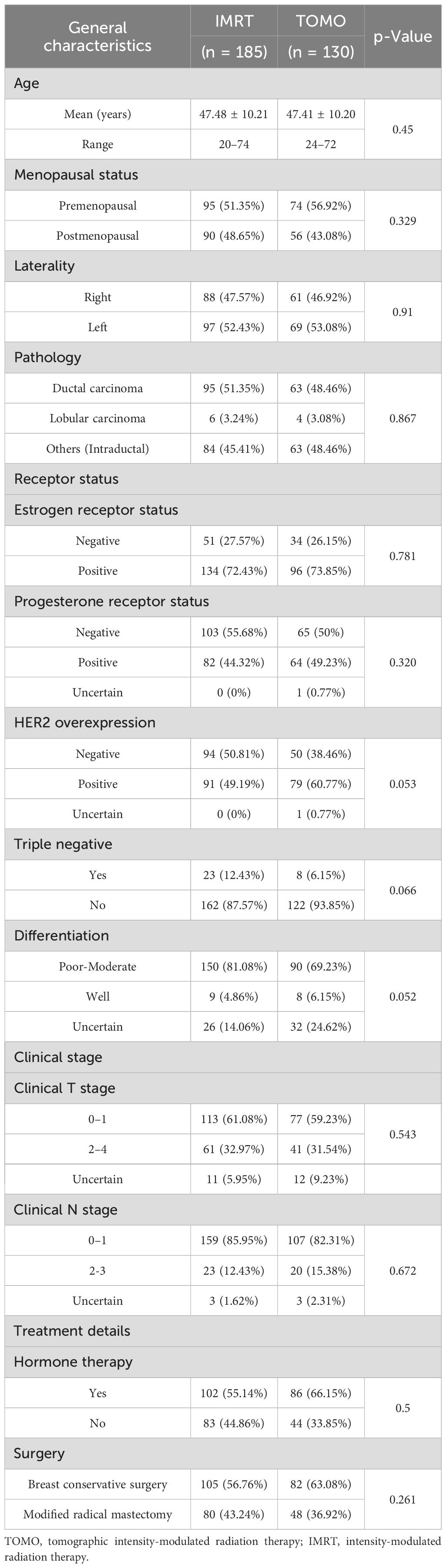 The baseline clinical characteristics were well-balanced between the TOMO and IMRT groups (Table 1), and no significant differences were observed in terms of age, menopausal status, laterality, pathology, estrogen receptor status, progesterone receptor status, triple negative, clinical T stage, clinical N stage, or surgical methods.