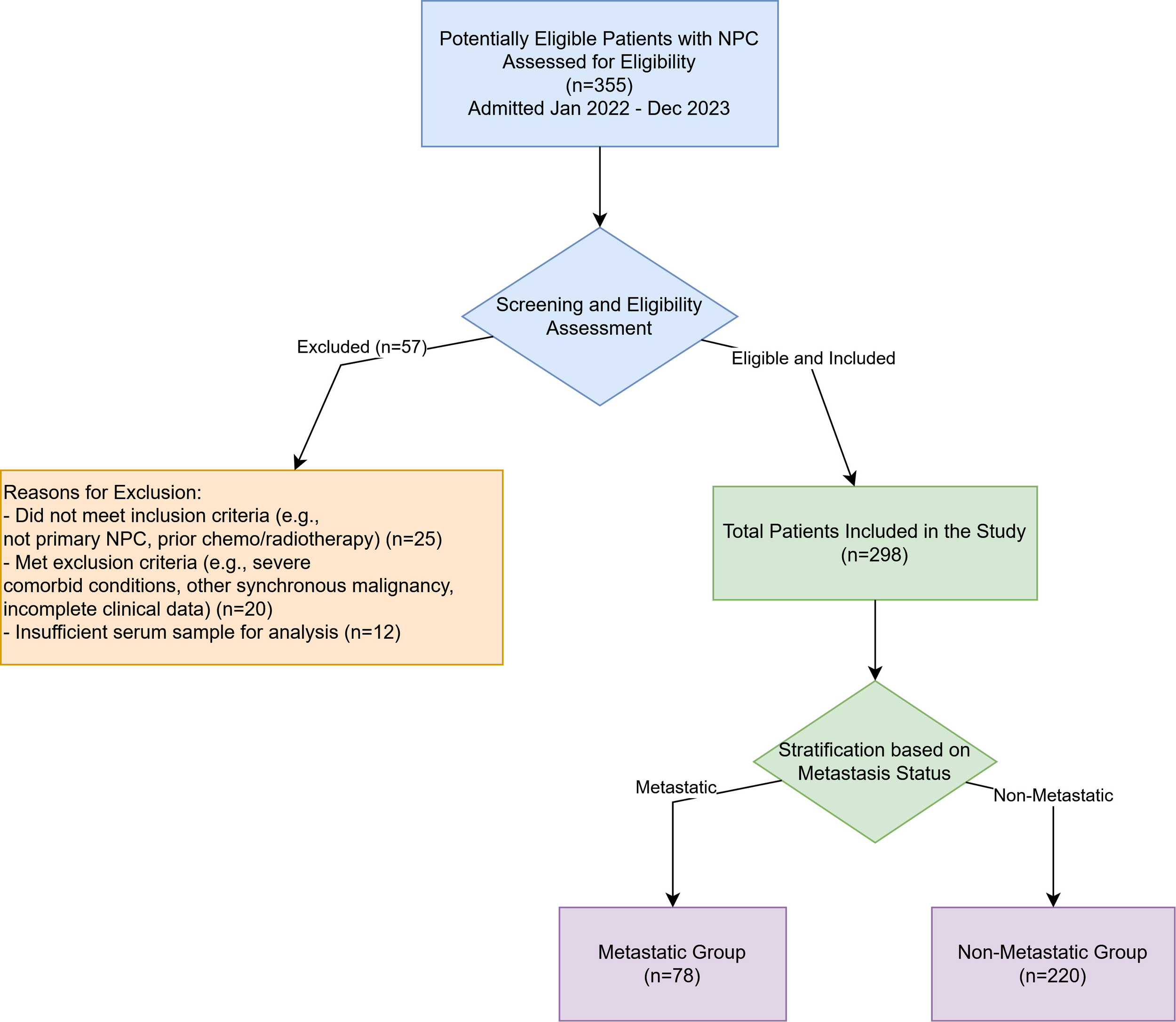 Flowchart of patient enrollment and selection. A total of 355 patients with nasopharyngeal carcinoma admitted between January 2022 and December 2023 were initially assessed for eligibility. Fifty-seven patients were excluded, resulting in 298 eligible patients who were included in the final analysis and subsequently stratified into the Metastatic Group (n=78) and the Non-Metastatic Group (n=220).