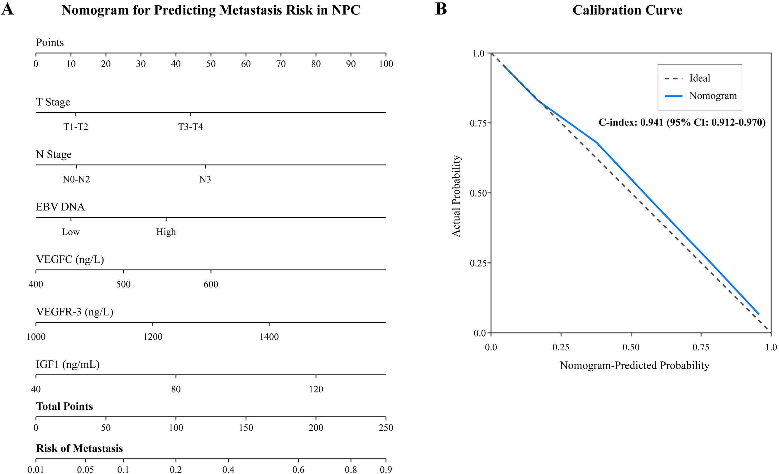 Serum levels of VEGFC, VEGFR-3, and IGF1 were significantly higher in the metastatic group compared to the non-metastatic group (P<0.05). Similarly, these markers were significantly elevated in patients with poor prognosis compared to those with good prognosis (P<0.05). Multivariate logistic regression analysis identified advanced T stage, N stage, high plasma EBV DNA load, and elevated serum VEGFC, VEGFR-3, and IGF1 levels as independent risk factors for NPC metastasis. Combined detection of serum VEGFC, VEGFR-3, and IGF1 yielded a significantly higher Area Under the Curve (AUC) for predicting NPC metastasis than individual markers, and a nomogram incorporating all independent risk factors showed excellent predictive performance (C-index: 0.941). Kaplan-Meier analysis revealed that patients with high levels of VEGFC, VEGFR-3, IGF1, or a high-risk score from the combined biomarker model had significantly poorer OS (all P<0.001).