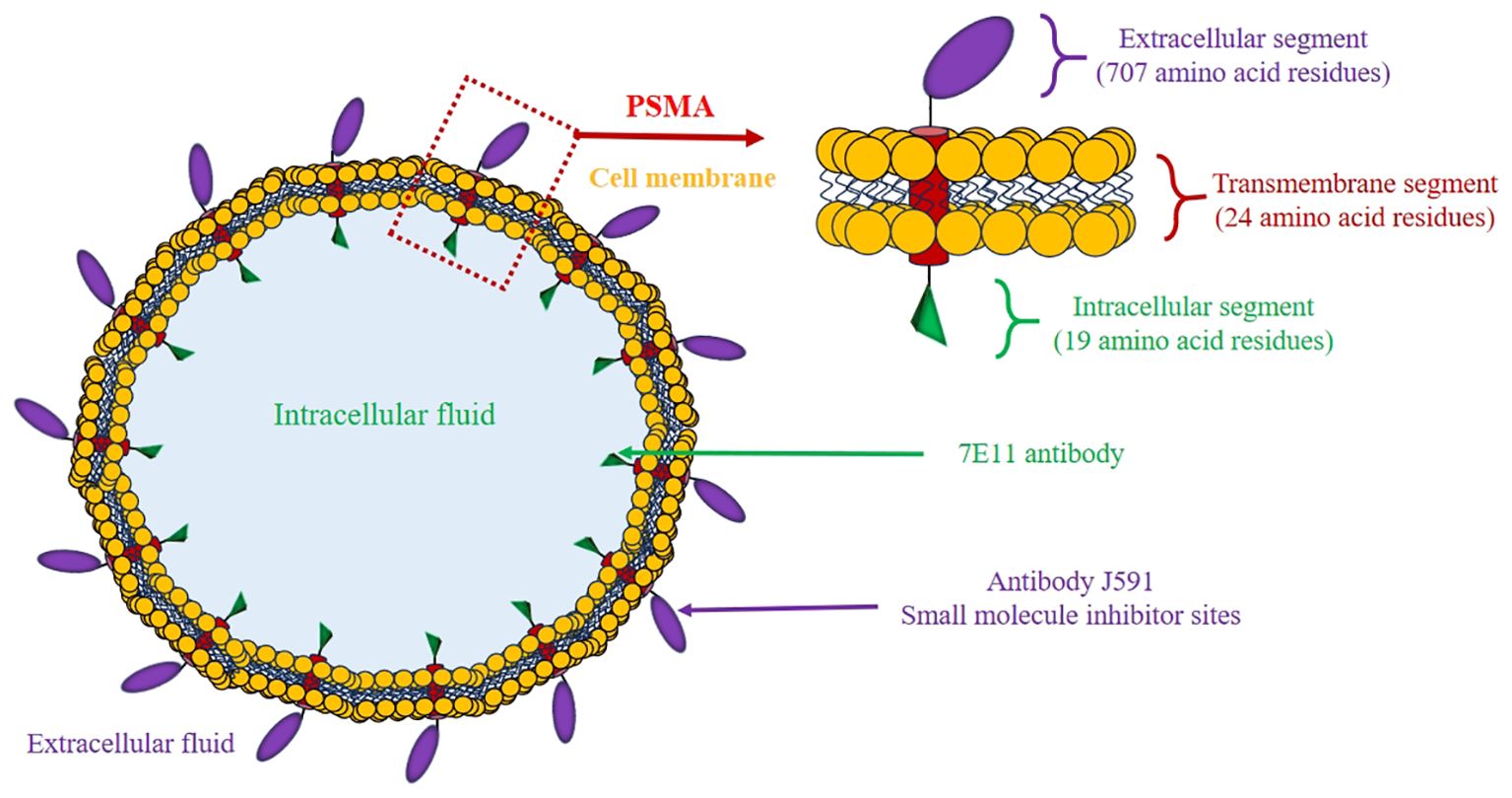 PSMA exhibits higher expression levels in PCa cells, and these levels tend to increase with stage and grade of the tumor. This is particularly prominent in advanced PCa, metastatic disease, and when biochemical recurrence develops (BCR). This highly specific membrane surface expression feature makes it an extremely valuable diagnostic and therapeutic target (27). The structural distribution of the PSMA membrane provides surface accessibility for the molecules designed to interact with it, particularly the large extracellular domains and defined binding. This feature also allows for the development of diverse ligands, and high-affinity and specificity (28).