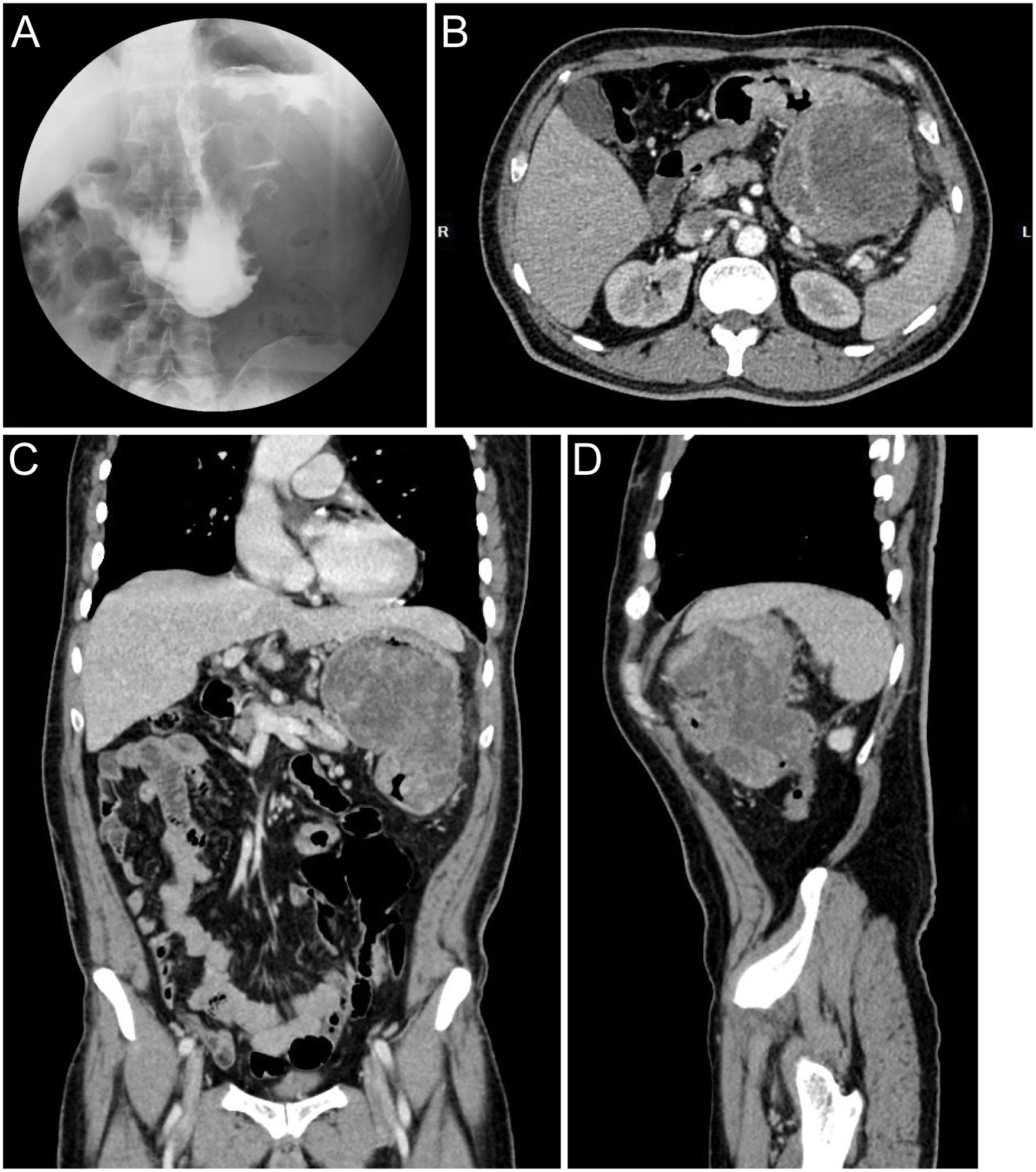 Figure 1. Preoperative radiographic images. (A) Upper GI series with barium contrast showing a large filling defect in the greater curvature gastric wall. Axial (B), coronal (C), and sagittal (D) contrast-enhanced CT images documenting a large mass contiguous with the gastric body.