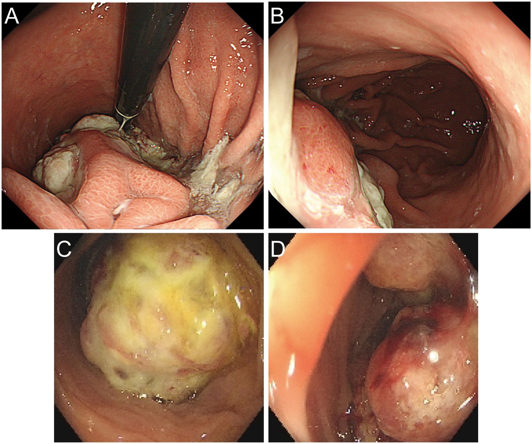 Figure 2. Preoperative endoscopic images. (A, B) Gastroscopic images demonstrating a giant irregular protrusion along the greater curvature of the gastric body. (C, D) Colonoscopic views revealing an ulcerated mass at the splenic flexure with significant luminal narrowing.