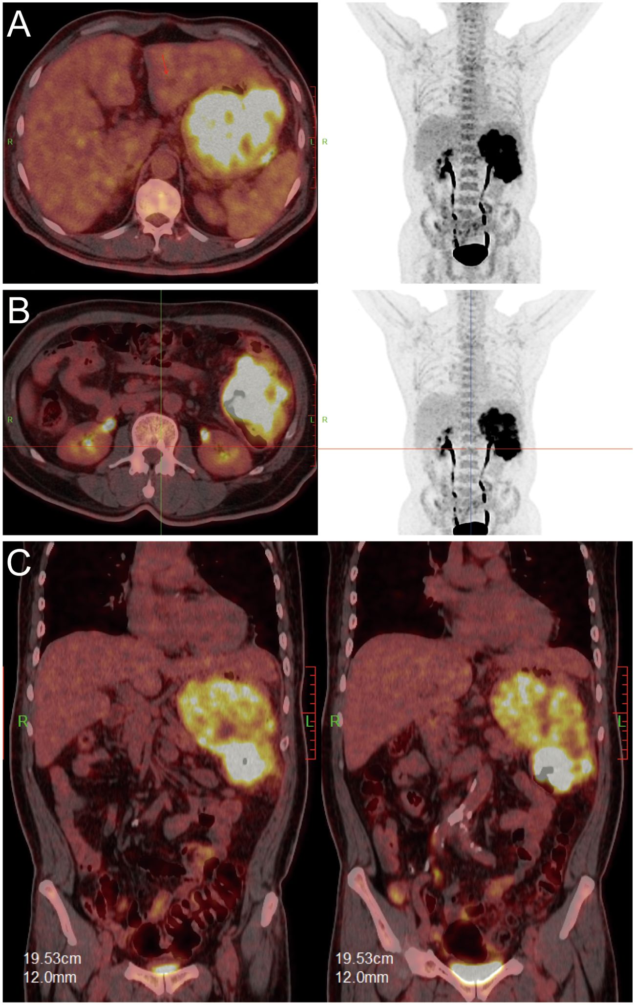 Figure 3. PET/CT fusion images. [(A, B): axial; (C): coronal] demonstrating hypermetabolic tumor involvement of the splenic flexure (SUVmax 39).