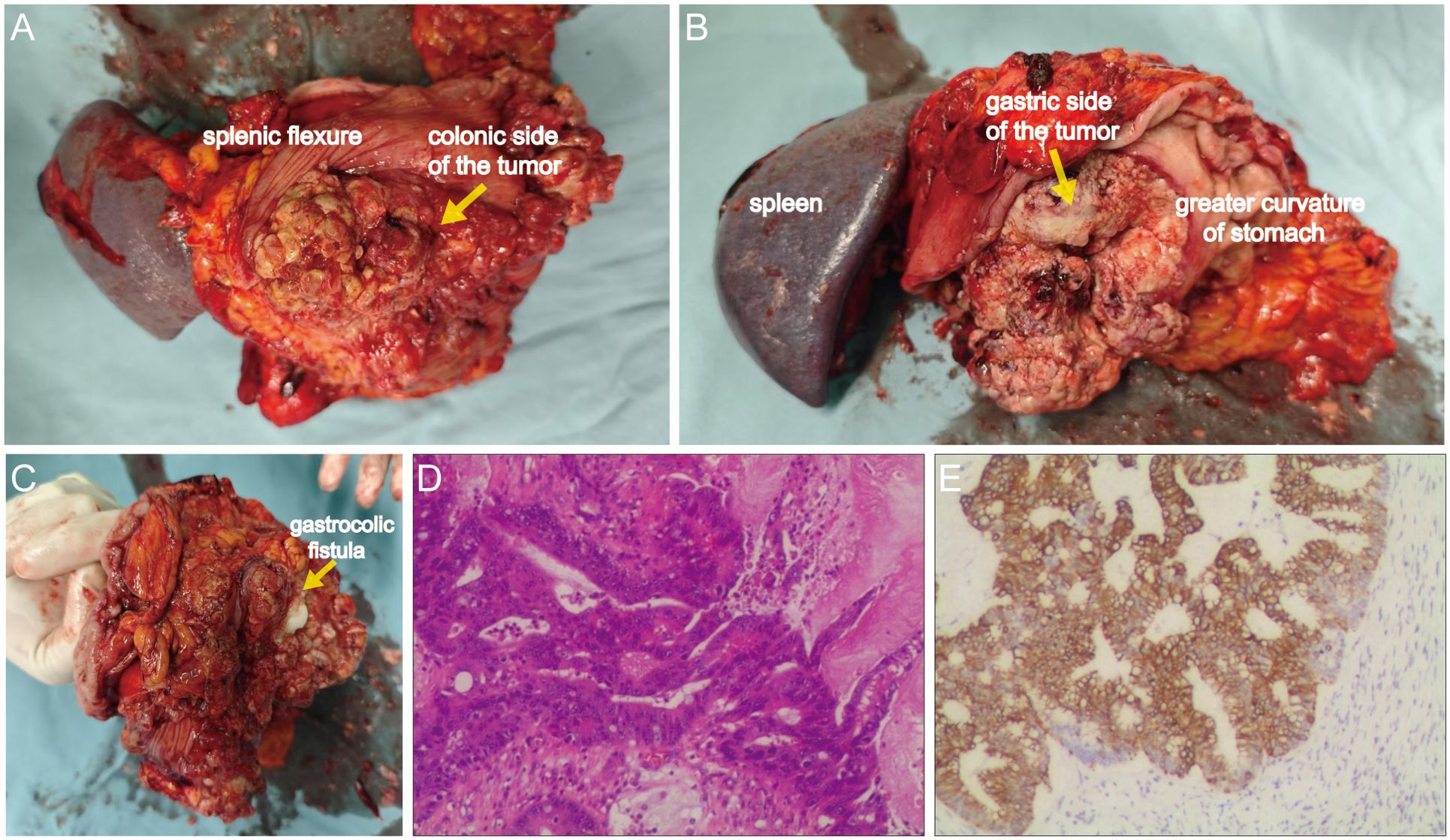 Figure 4. Gross surgical specimen and histopathological findings. (A) Anterior view of the tumor from the splenic flexure aspect. (B) Posterior view of the lesion from the gastric greater curvature aspect. (C) Identification of the gastrocolic fistula via exploration with fingers. (D) Hematoxylin and eosin (H&E) staining demonstrating moderately-poorly differentiated adenocarcinoma (100×). (E) Cytokeratin 20 (CK20) immunohistochemistry confirming colorectal origin (100×).