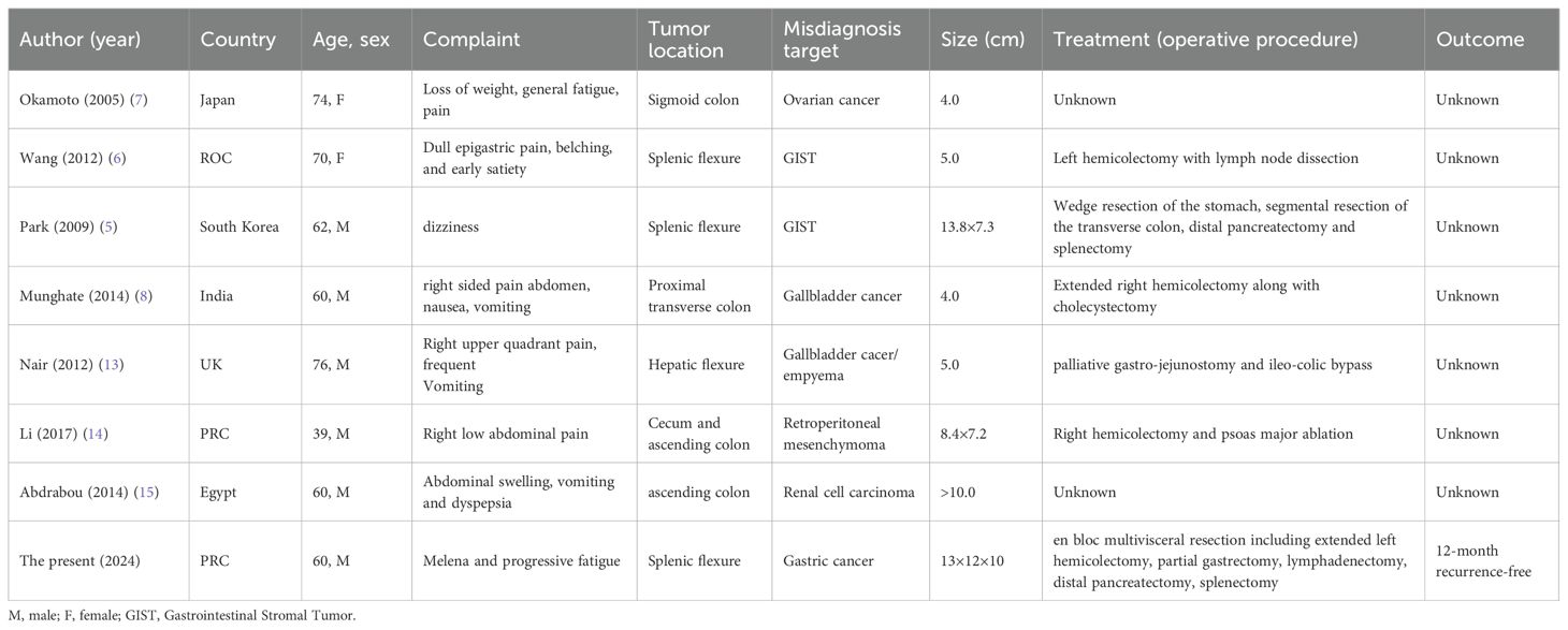 Exophytic growth patterns represent rare manifestations in both gastric and colonic malignancies. While gastric cancer often exhibits extensive submucosal infiltration with a propensity for longitudinal spread along the gastric wall. In contrast, colorectal cancer predominantly demonstrates circumferential transmural infiltration leading to luminal narrowing. This case illustrates a diagnostically challenging scenario where exophytic transvisceral gastric invasion precipitated initial misdiagnosis. Notably, the splenic flexure adenocarcinoma demonstrated mixed endophytic-exophytic growth with exophytic predominance—an exceptionally rare manifestation of colon cancer. Previous reports, including two cases by Park et al. (2009) (5) and Wang et al. (2012) (6) of colon cancer masquerading as gastric stromal tumor with intact mucosa appearance, document similar diagnostic pitfalls. Comparatively, our case presented with more extensive gastric mucosal involvement, occult gastrocolic fistula and larger tumor dimensions, substantially increasing misdiagnosis risk. Because exophytic colon cancer is extremely rare, when the mass is large and adjacent to other organs, it is difficult to identify its primary site and misdiagnosis can easily occur. Hence, we performed a brief review of literature documenting cases where exophytic colonic carcinomas were misinterpreted as primary neoplasms of adjacent organs (Table 1).
