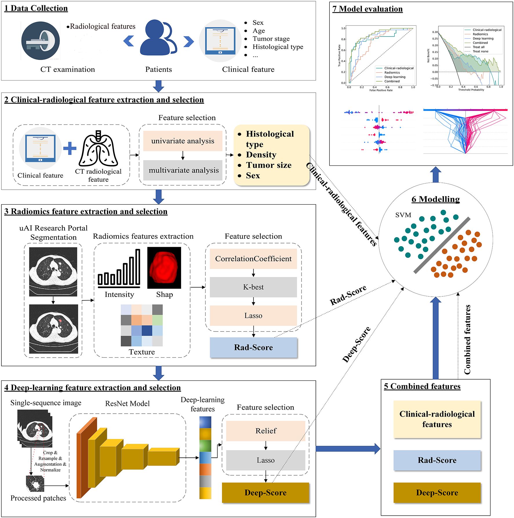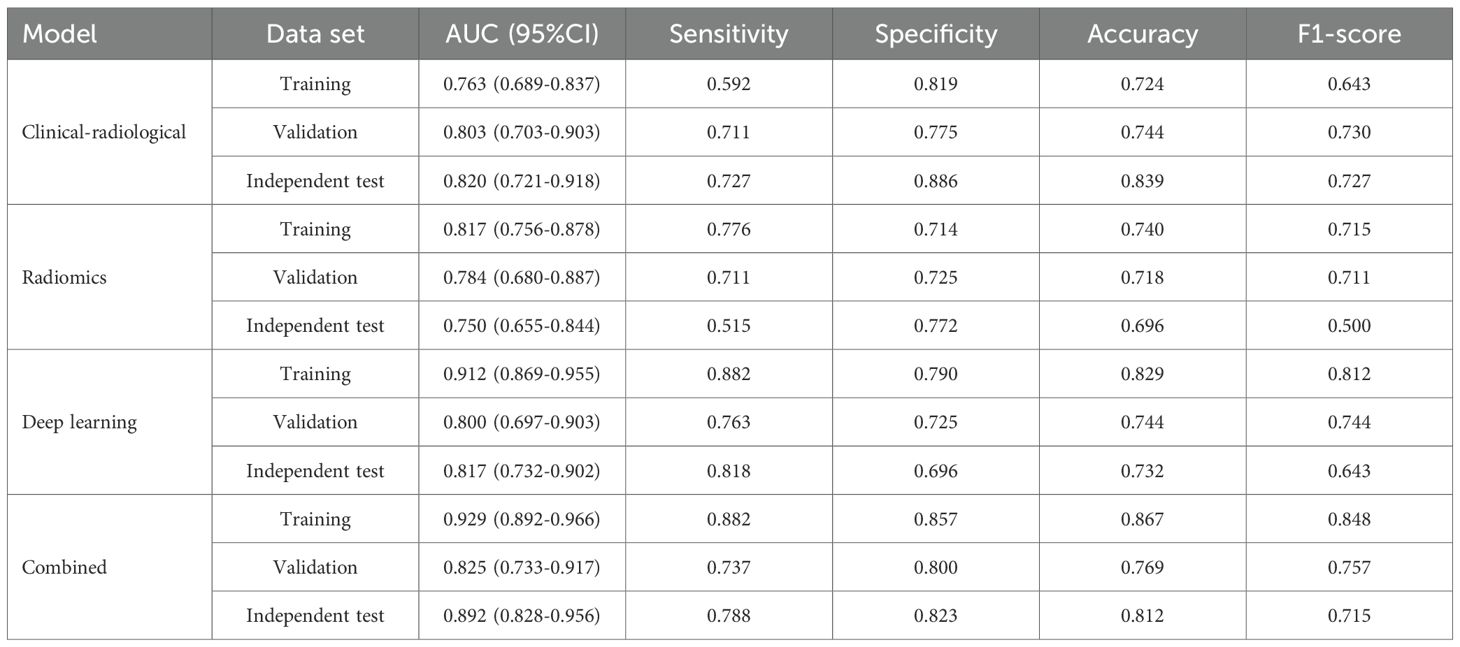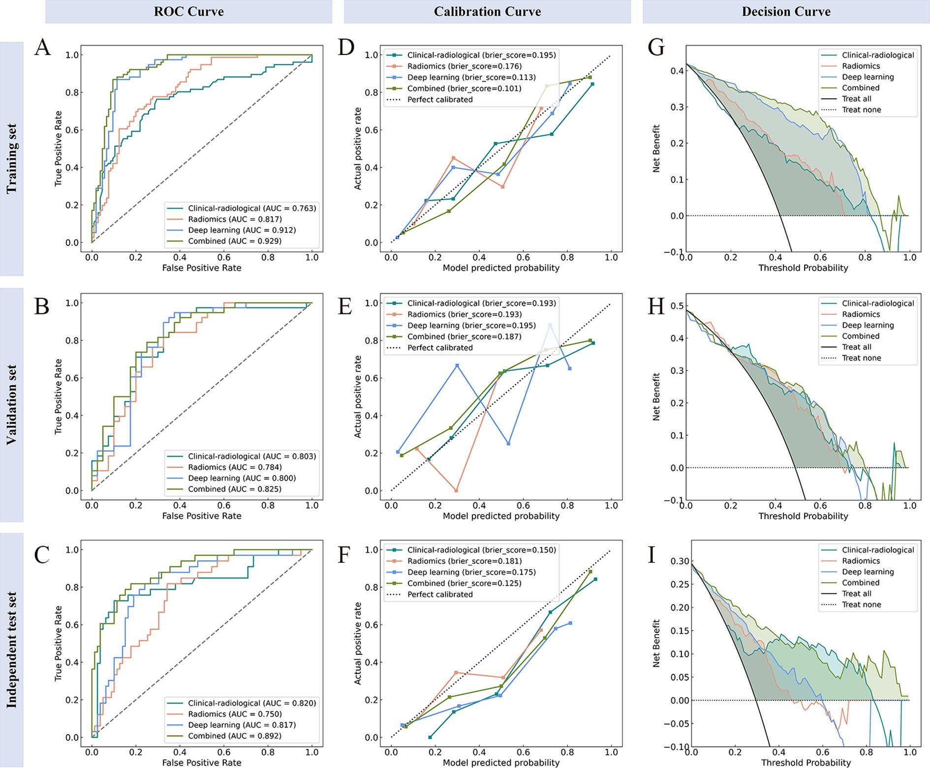 All modeling was conducted within the uAI Research Portal using the open-source Scikit-learn library (Scikit-learn 0.23.2). To ensure a fair comparison of predictive performance across feature modalities, clinical-radiological (based on independent clinical-radiological features), radiomics (using rad-score), and deep learning (using deep-score) models were developed with a uniform support vector machine (SVM) classifier. SVM is well-suited for handling high-dimensional data and potential non-linear relationships. For the combined model integrating clinical-radiological features, rad-score, and deep-score, the SVM classifier was compared against four other algorithms: Decision Tree, Random Forest, XGBoost, and Logistic Regression. The SVM demonstrated better performance on the validation set (Supplementary Table S1) and was consequently selected. All models were optimized for hyperparameters via grid search, with the specific parameters detailed in Supplementary Table S2.