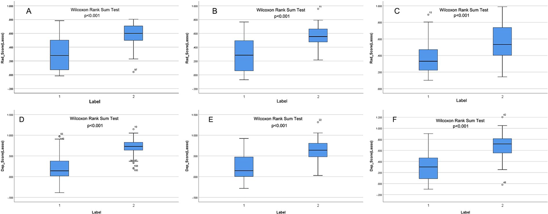 Figure 2. (A–F) show the rad-score and deep-score in training, validation, and independent test sets, respectively. Label 1 and Label 2 indicate the low- and high-expression groups.