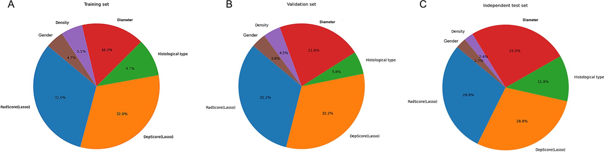 Figure 5. The relative contribution of features in the training (A), validation (B), and independent test (C) sets.