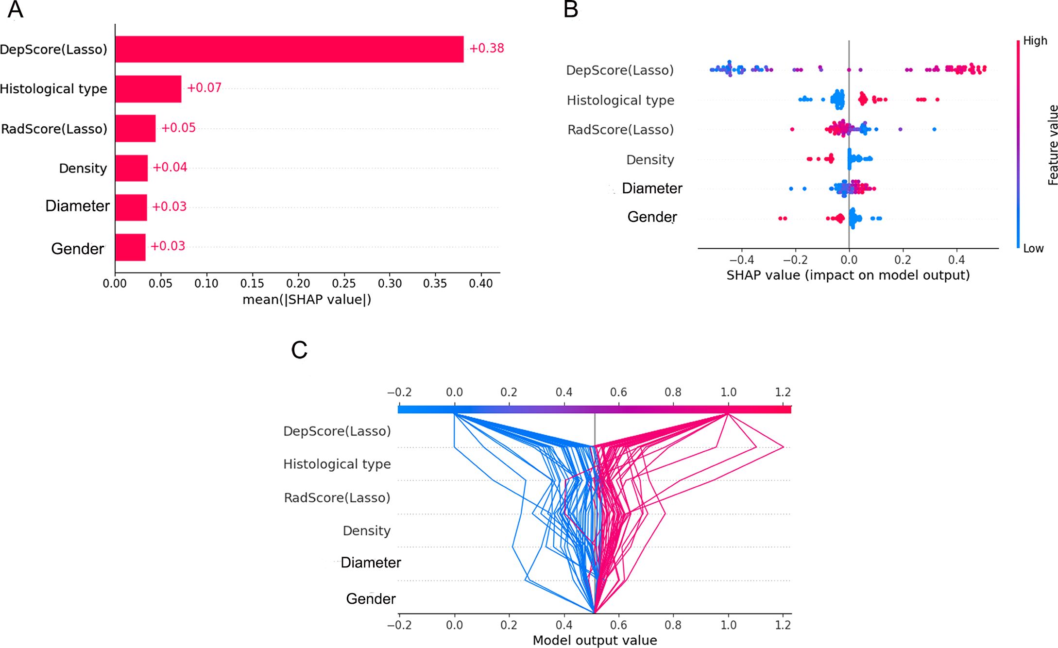 For global feature analysis: the importance plot (Figure 6A) showed the relative significance ranking of features, with Deep-score being the most influential; the bee-swarm plot (Figure 6B) displayed SHAP values for each sample across features (positive values increased the probability of high Ki-67 expression, while negative values reduced it); the decision plot (Figure 6C) illustrated cumulative feature impacts on model predictions, with gray lines denoting baseline values, red trajectories mapping positive samples (high-expression group), and blue trajectories tracking negative samples (low-expression group).
