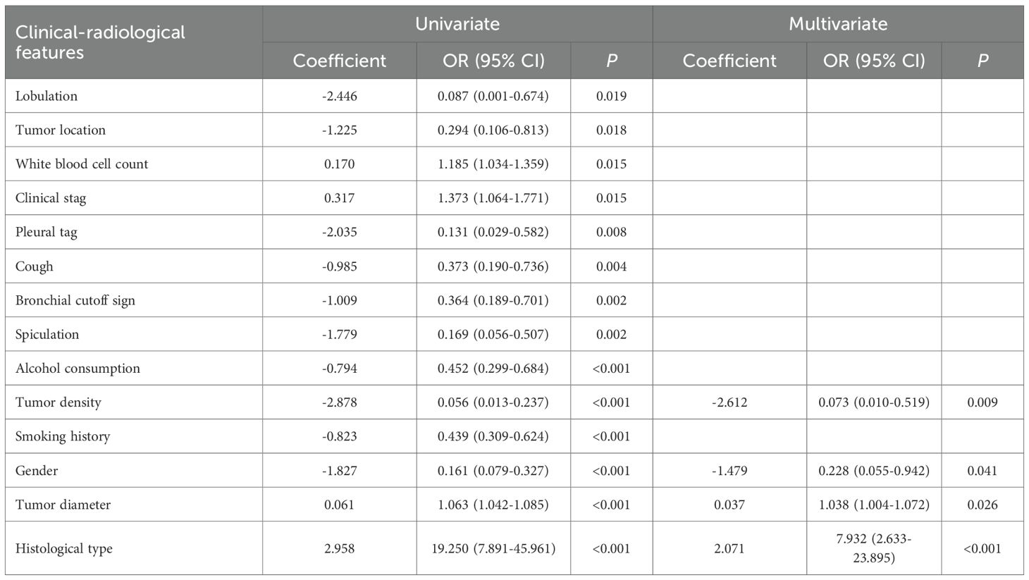 The uAI Research Portal (29) (version: 20240730, https://urp.united-imaging.com/; Shanghai United Imaging Intelligence Co., Ltd., Shanghai, China), a licensed commercial platform, was employed for image segmentation and all subsequent classification modeling. This one-stop analysis system for multimodal clinical research images was developed using Python (version 3.7.3) and incorporated the widely used PyRadiomics package. Access to the platform was granted under our institutional license agreement with the vendor. Using the platform’s integrated VB-Net model, regions of interest (ROIs) were automatically segmented and reconstructed into 3D volumes of interest (VOIs). This model, previously validated for pulmonary nodules [average Dice similarity coefficient (DSC): 0.915] (30). Additionally, a three-tier arbitration mechanism was established: two radiologists with 5 and 8 years of experience, respectively, independently performed slice-by-slice corrections of the ROIs. The inter-observer DSC was 0.887. For regions with high inter-observer agreement (DSC ≥ 0.700), the contours from the more experienced radiologist (8 years) were used. In cases of inter-observer discrepancies (DSC < 0.700), a senior radiologist with over 15 years of experience arbitrated and finalized the contours.