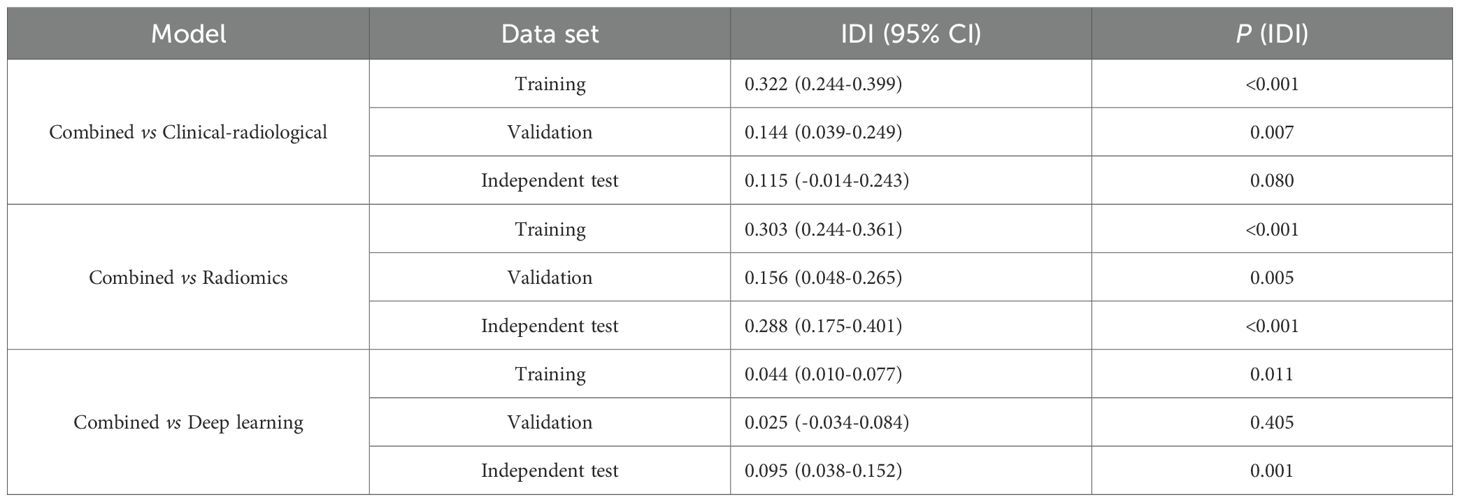The combined model performance metrics revealed AUC values of 0.929 in the training set, 0.825 in the validation set, and 0.892 in the independent test set (Table 3, Figures 4A–C). In the independent test set, the combined model demonstrated significant improvements in overall predictive performance, with IDI values of 0.115, 0.288, and 0.095 over the clinical-radiological, radiomics, and deep learning models, respectively (Table 4). The DCA demonstrated that the combined model had a superior clinical net benefit than all the other models (Figures 4D–F). The calibration curves revealed that the combined model displayed strong agreement between predictions and pathology results (Figures 4G–I), with Brier scores of 0.101 (training set), 0187 (validation set) and 0.125 (independent test set), indicating excellent probabilistic calibration. Among all the features, deep-score and rad-score contributed the most to the prediction (Figures 5A–C).