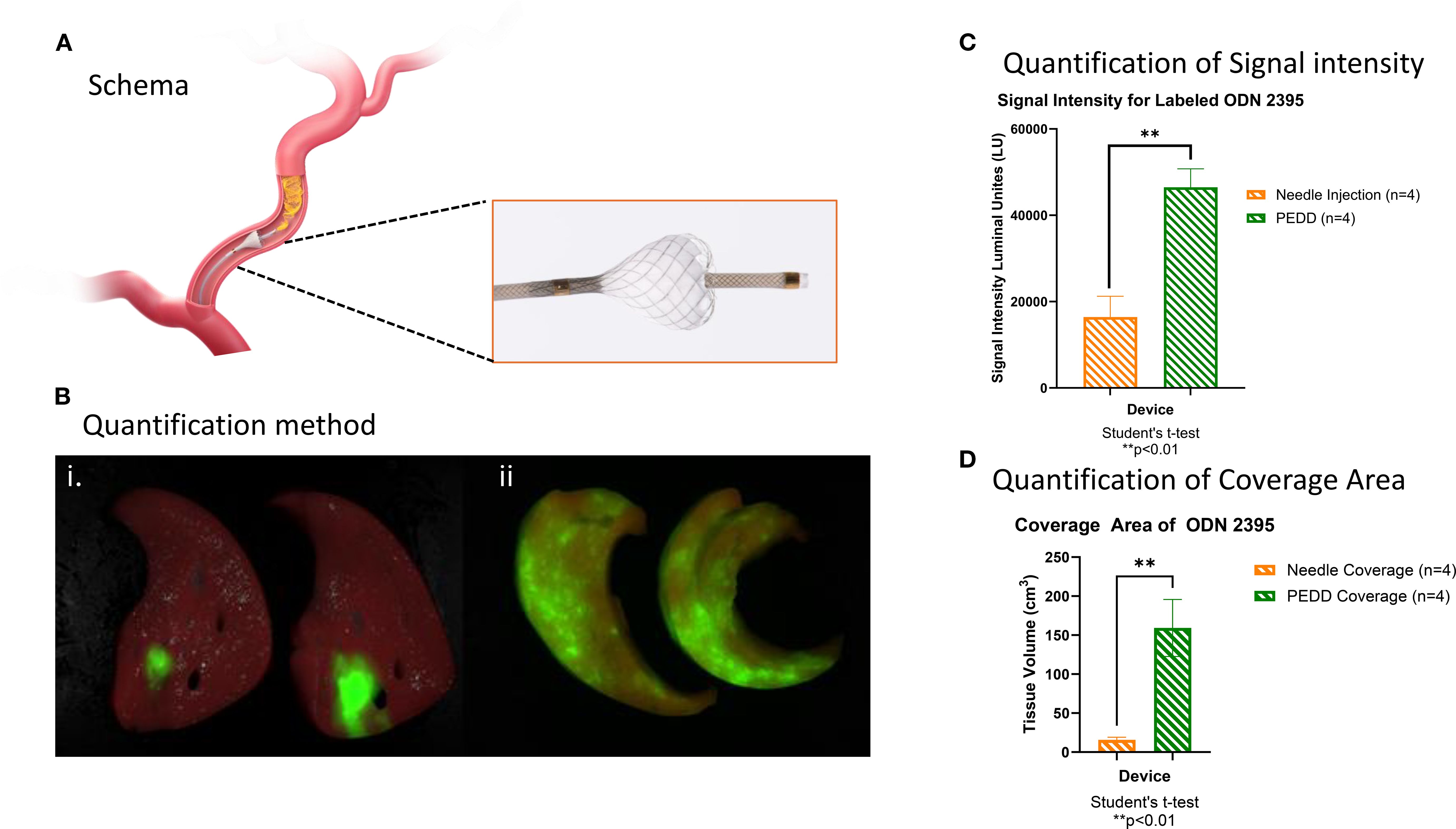 As shown in Figure 1A, the TriNav infusion system was placed in the hepatic artery, and 2.5 nM of labeled ODN2395 was delivered. As presented in Figure 1B, PEDD using the TriNav device appeared to increase the amount of tissue treated with ODN2395. PEDD resulted in statistically significant increases in both signal intensity (46483 ± 4285 lu vs.16438 ± 4793 lu; p<0.01) (Figure 1C) and tissue coverage measured for labeled ODN2395 (159.2 ± 36.6 cm3 vs. 15.7 ± 3.3 cm3; p< 0.05) when compared to needle injection (Figure 1D).