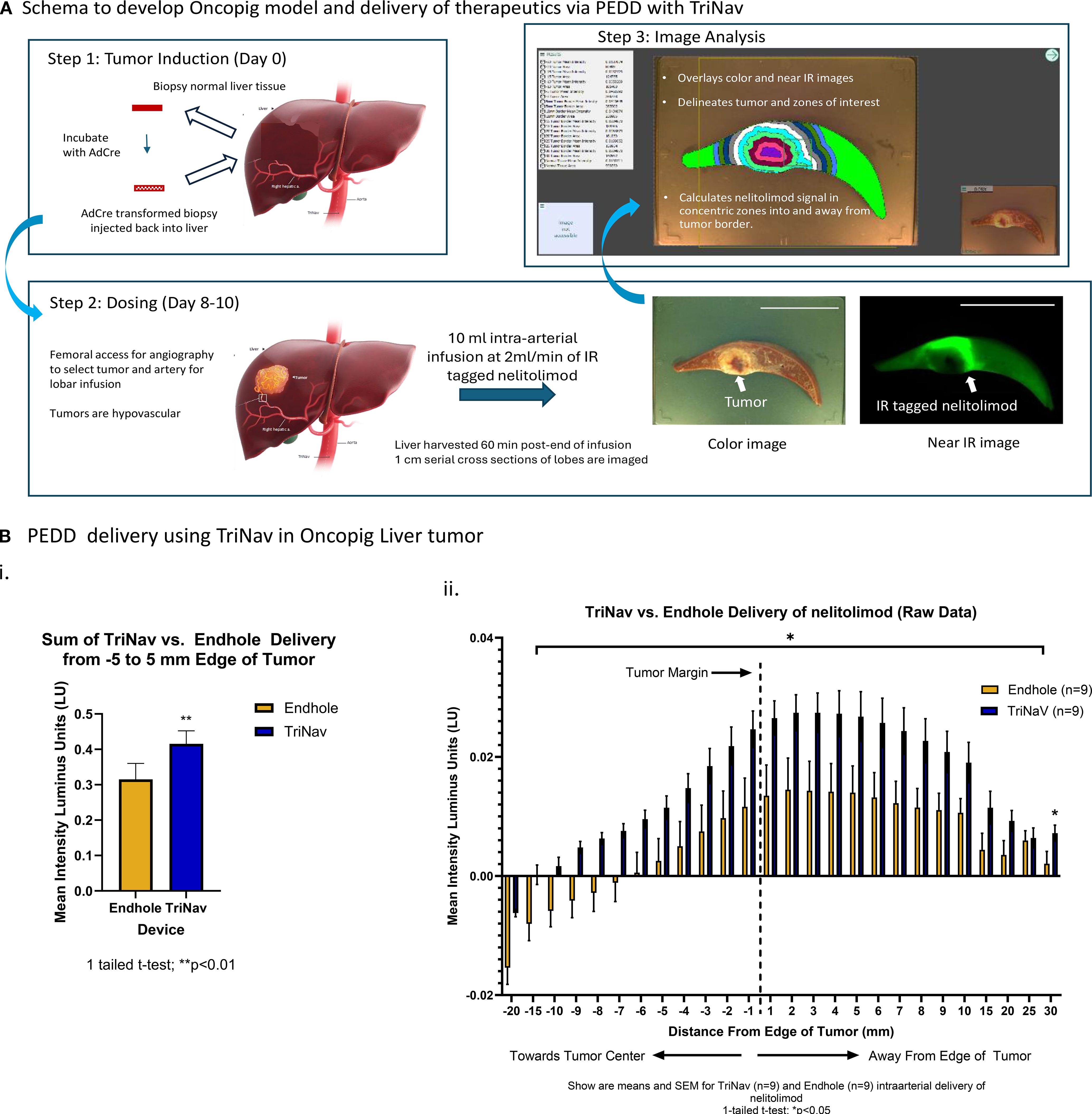 Figure 2. PEDD with TriNav was superior to endhole catheter for intra-arterial regional delivery of therapeutics in oncopig liver tumors. (A) Schematic illustration of the oncopig model development and data processing methodology. Tumors are induced in the transgenic oncopig by collecting liver biopsies, which are re-injected into the liver after incubation with AdCre. Treatments are administered after 8–10 days of tumor growth. One-centimeter cross-sections of the liver tissue are imaged in bright field to obtain high-resolution tumor outlines using the algorithm, which were used to quantify treatment signals detected in near-IR images within corresponding 1mm zones extending from the tumor margin. Scale (5 cm). (B) Quantification of labeled nelitolimod delivery via PEDD using the TriNav Infusion System compared to a traditional microcatheter. i. Total signal intensity summed across the -5 to 5 mm zone measured from the tumor margin. ii. Signal intensity measured in 1 mm zones from the tumor margin. The vertical dash line at 0 on the X axis represents the tumor margin, each pair of the two bars represents signal intensity measured in the 1mm band zone away from the tumor margin/previous 1mm zone. Data are presented as mean ± SEM for TriNav (n=9) and TMC (n=9) intra-arterial delivery of labeled nelitolimod (* indicates p < 0.05).