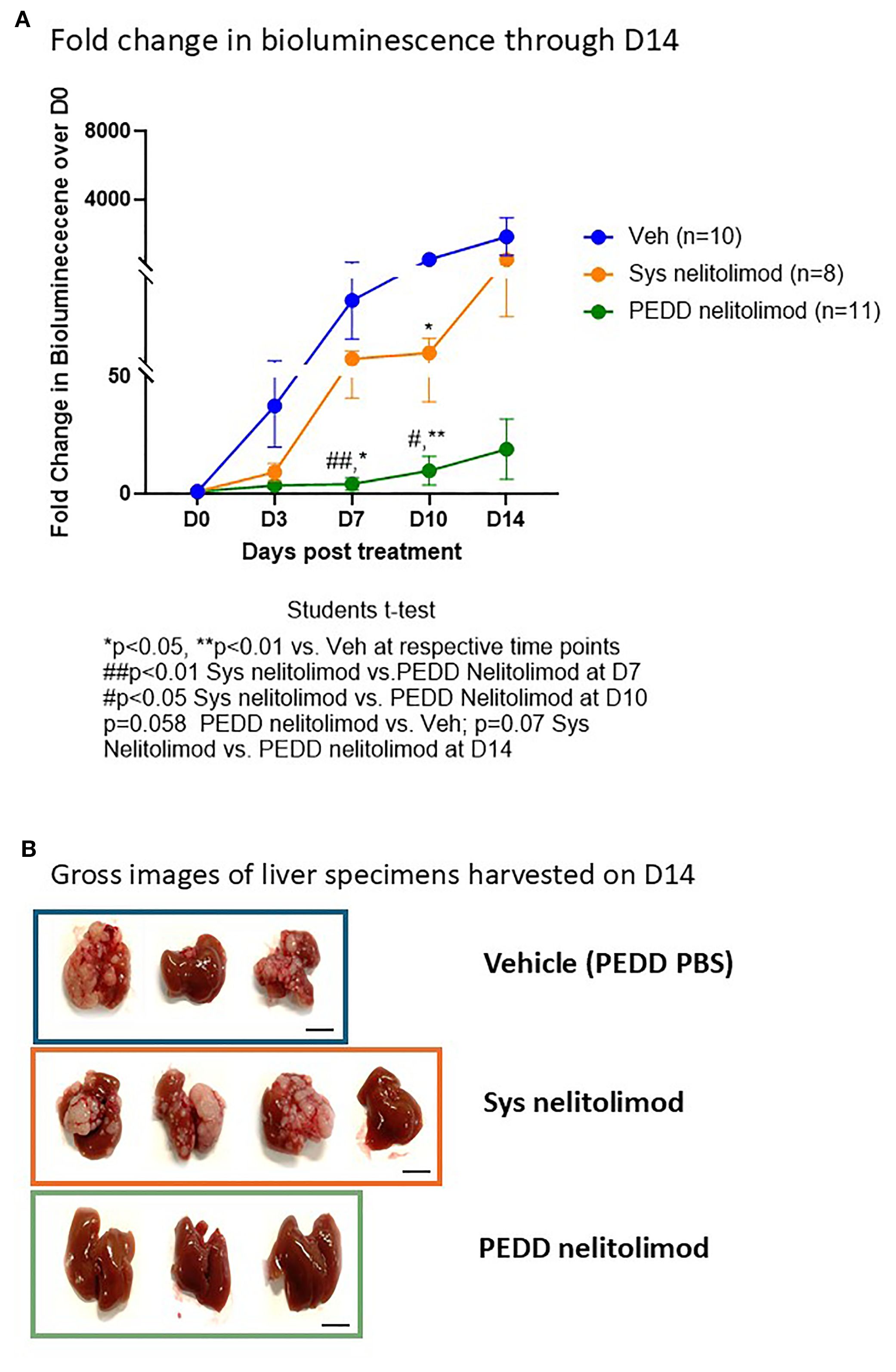 Figure 3. PEDD nelitolimod controlled the tumor progression better than systemic nelitolimod. (A) Bioluminescence values were determined by IVIS on D0, D3, D7, D10 and D14. PBS delivered via PV using PEDD served as Veh control. Fold change of the tumor burden was calculated based on D0 baseline bioluminescence (total flux/sec). (B) Mice were sacrificed on D14, and representative images (n=3–4 per group) depicting the gross images of the harvested livers. Scale (1 cm). Data presented as mean ± SEM; and p value is mentioned in the graph.