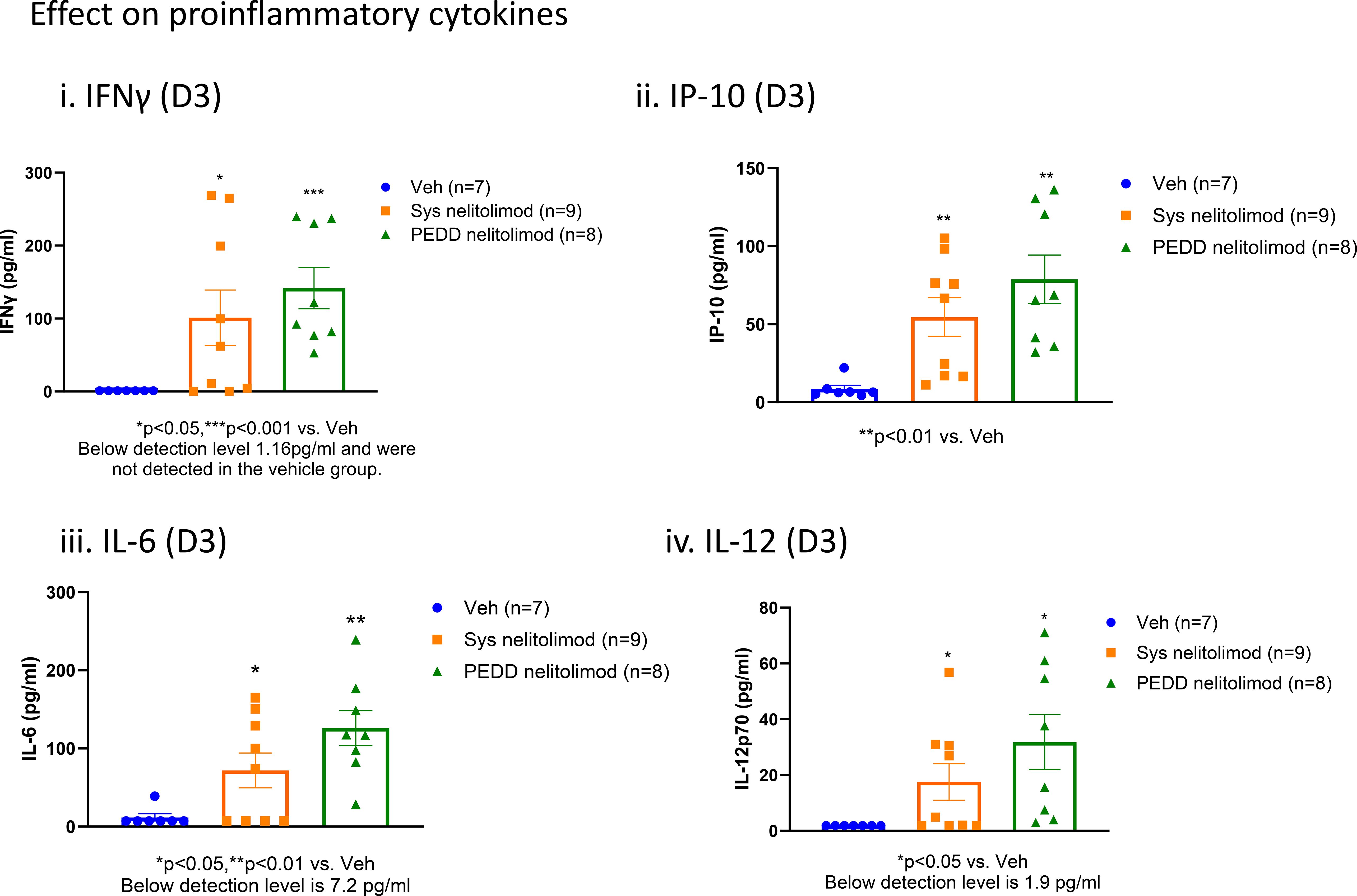 Figure 4. Peripheral effects of nelitolimod delivered by PEDD. Mouse serum collected at D3 was analyzed by Luminex for circulatory IFNγ (i), IP-10 (ii), IL-6 (iii), IL-12 (iv), and IL18 (v). Data presented as mean ± SEM; and p value is mentioned in the graph.