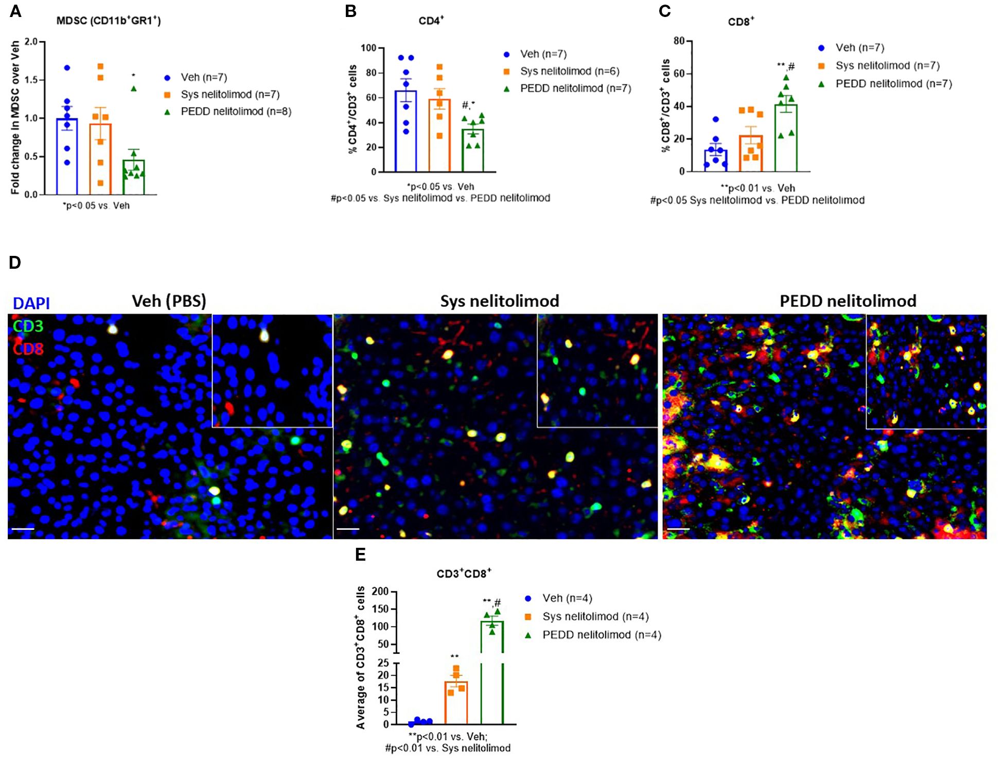 We investigated the status of the immunosuppressive MDSC cells and cytotoxic T cells within the tumor by performing flow cytometry. We found that nelitolimod delivered via PEDD reduced the MDSC and CD4+ cells within the liver significantly compared to Veh (Figures A, B). In contrast, the percentage of cytotoxic CD8+T cells was elevated (Figure 5C) within the tumor. We further confirmed the finding by immunofluorescence and found that there was a significant increase in CD8+ T cell infiltration (Figure 5D) in PEDD nelitolimod as compared to both Veh and Sys Nelitolimod groups (p<0.01). Conversely, there was a decrease in MDSCs (Figure 5E) in the PEDD nelitolimod group as compared to Veh (p<0.05). Therefore, nelitolimod delivered via PEDD promoted better anti-tumor immunity compared to Sys nelitolimod.