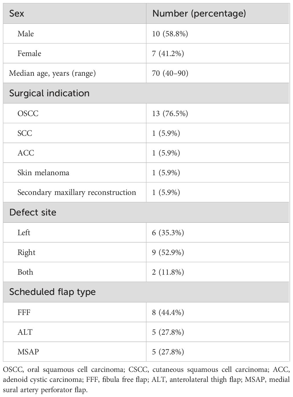Seventeen patients scheduled for surgery with eighteen perforator flaps were included in this study with a mean age of 67 years (range 40-90 years). The majority of the patients were scheduled for FFF reconstruction (44%). Patient demographics are shown in Table 1.