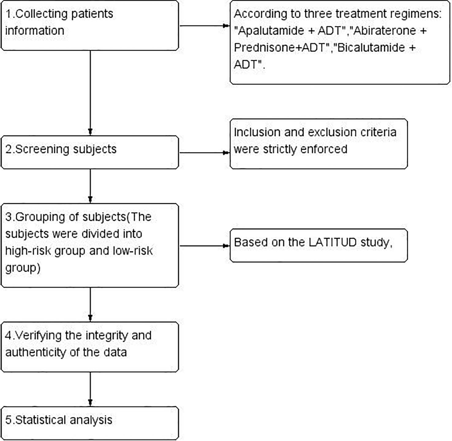 We retrospectively collected data from our hospital between January 2019 and March 2024 on patients with metastatic hormone-sensitive prostate cancer (mHSPC) who received apalutamide (240 mg/day) combined with ADT (Group A), abiraterone (1000 mg/day) plus prednisone (5 mg/day) combined with ADT (Group B), or bicalutamide (50 mg/day) combined with ADT (Group C). All patients were required to continue using ADT (except for those who underwent bilateral orchiectomy), with ADT mainly involving LHRH agonists (such as goserelin acetate, triptorelin acetate, leuprorelin acetate) to maintain serum testosterone levels below 50 ng/dL (<1.7 nmol/L). The study design and flowchart are referenced in (Figure 1).