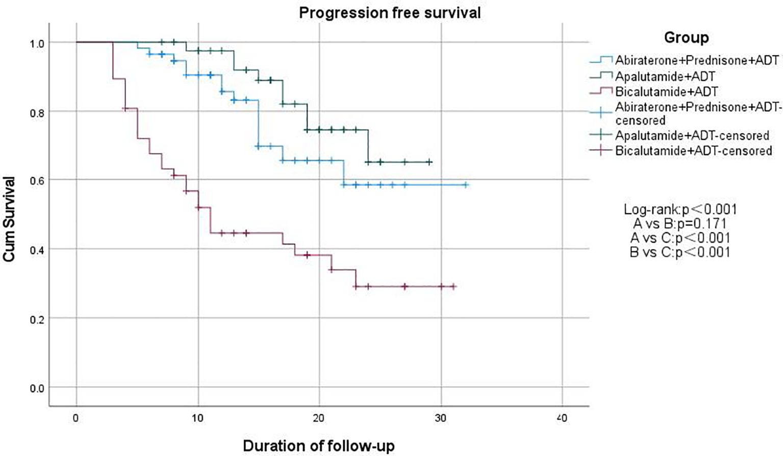 Methods: We retrospectively collected survival data of patients treated at our hospital from January 2019 to March 2024. Patients who received three different treatment regimens—Apalutamide (240 mg/day) combined with ADT, Abiraterone (1000 mg/day) plus Prednisone (5 mg/day) combined with ADT, and Bicalutamide (50 mg/day) combined with ADT.