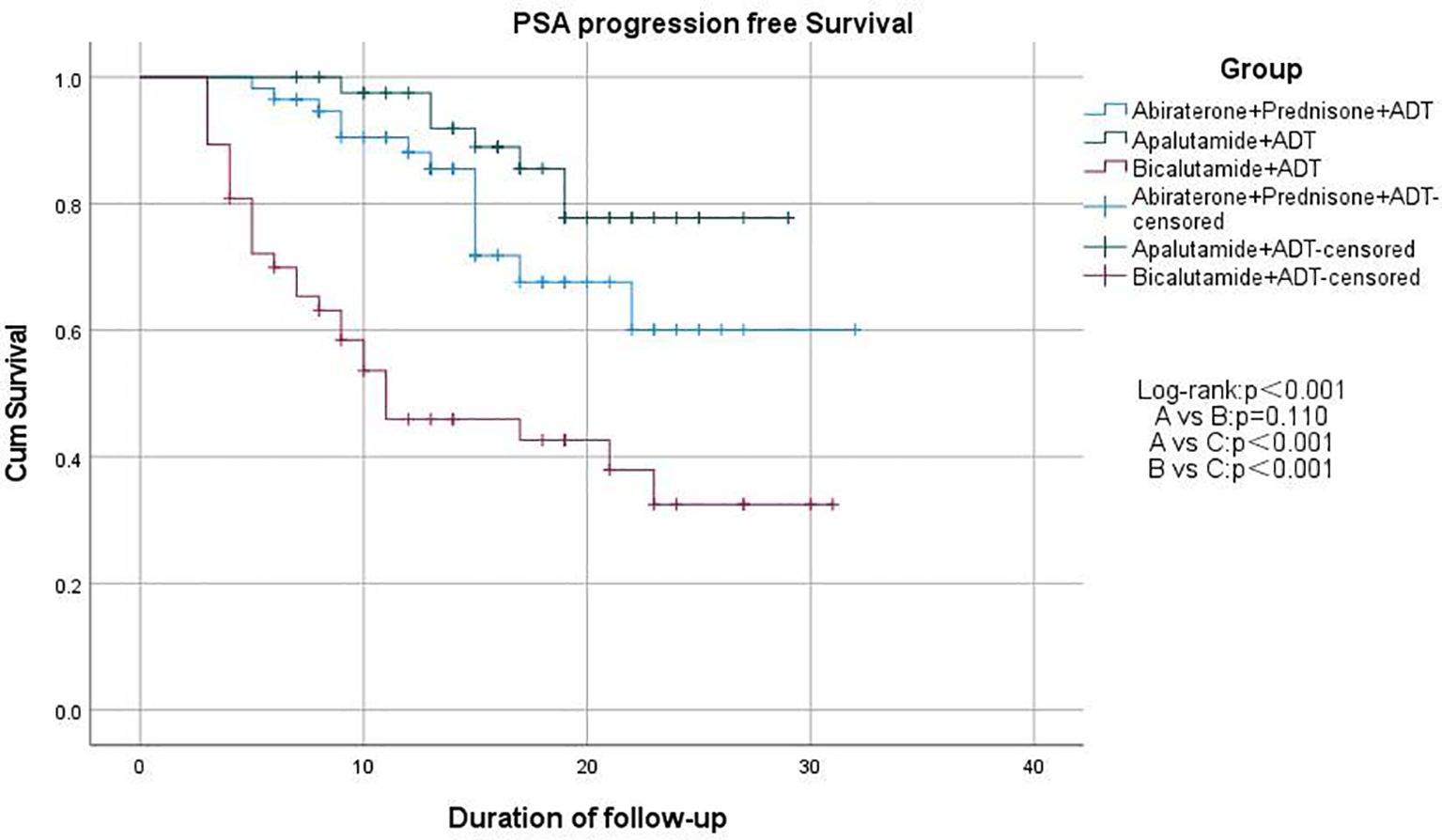 We used Kaplan-Meier survival curves to evaluate patients’ progression-free survival (PFS) and performed statistical analysis using the log-rank test. We found that treatment regimens A and B significantly prolonged PFS compared to regimen C (p < 0.001), but there was no significant difference between regimens A and B (p = 0.171; Figure 2). Additionally, we compared PSA-PFS among the three groups, and the results were similar to those for PFS (Figure 3). The median PFS and PSA-PFS in Group C were both 11 months, while neither was reached in Groups A and B.