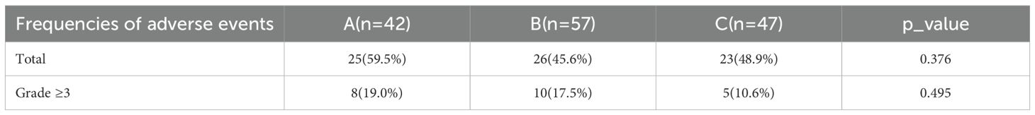 During the treatment with the three drugs, we summarized the types and frequencies of adverse events experienced by patients, as well as those classified as grade ≥3 (Supplementary File: Table 4). The main adverse events in Group A included pain, fatigue, and hot flashes. Group B primarily reported edema, pain, and fatigue. Group C mainly included pain, gastrointestinal reactions, and sleep disturbances. No life-threatening serious adverse events occurred with any of the three drugs. We conducted a summary analysis of the results (Table 2); the incidence of adverse events in Group A was 59.5%, which was higher than that in Group B (45.6%) and Group C (48.9%), but the difference was not statistically significant (p = 0.376). The incidence of grade ≥3 adverse events in Group A (19.0%) was slightly higher than that in Group B (17.5%) and Group C (10.6%), but overall, the results also showed no statistical differences (p = 0.495).