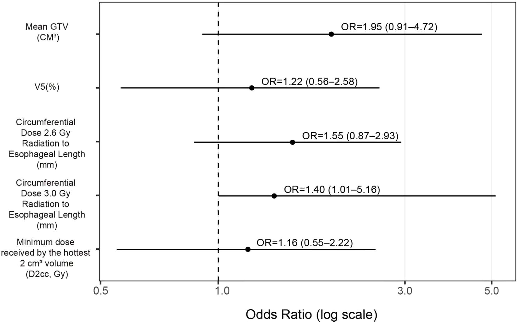 The forest plot indicates that all five variables are positively associated with the risk of ≥G3 RIE, with the circumferential ≥3.0-Gy length emerging as an independent correlate (OR=1.40, 95% CI 1.01–5.16). The remaining predictors did not reach statistical significance but showed concordant directions, suggesting an upward risk trend (see Figure 1): mean GTV, OR 1.95 (95% CI 0.91–4.72); V5, OR 1.22 (0.56–2.58); circumferential length ≥2.6 Gy/fx, OR 1.55 (0.87–2.93); D2cc, OR 1.16 (0.55–2.22).
