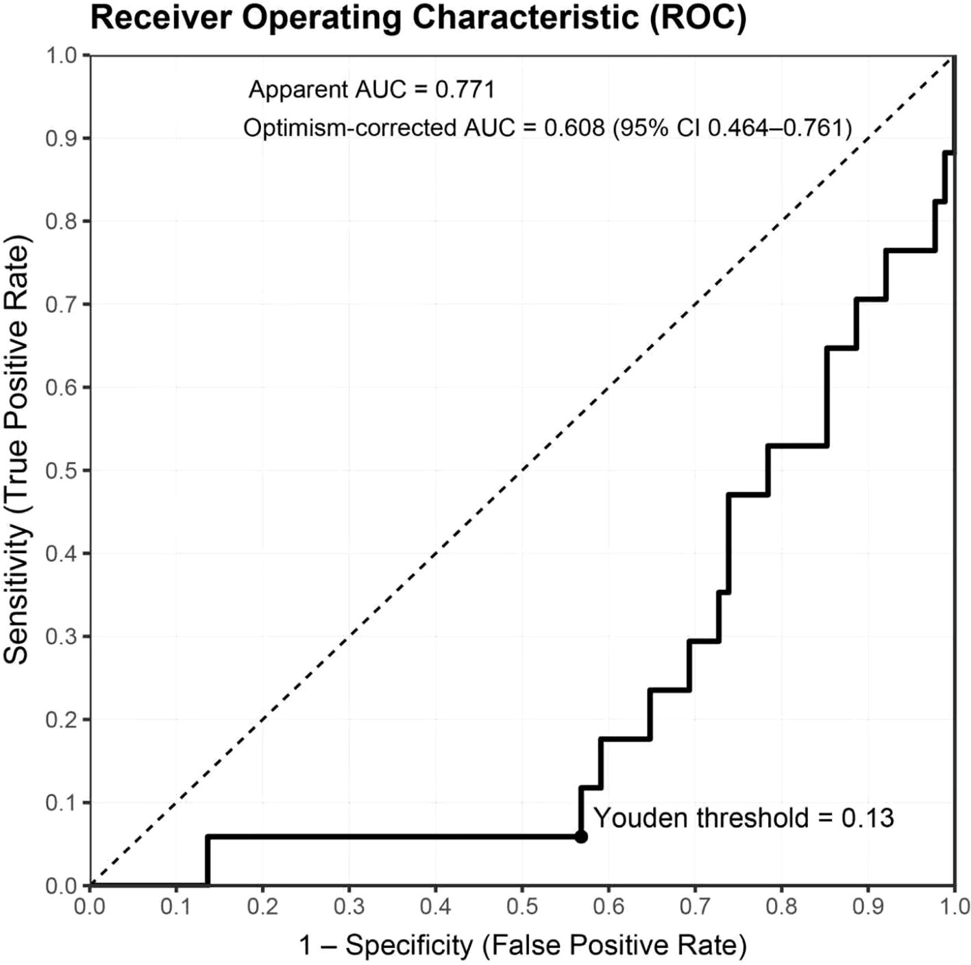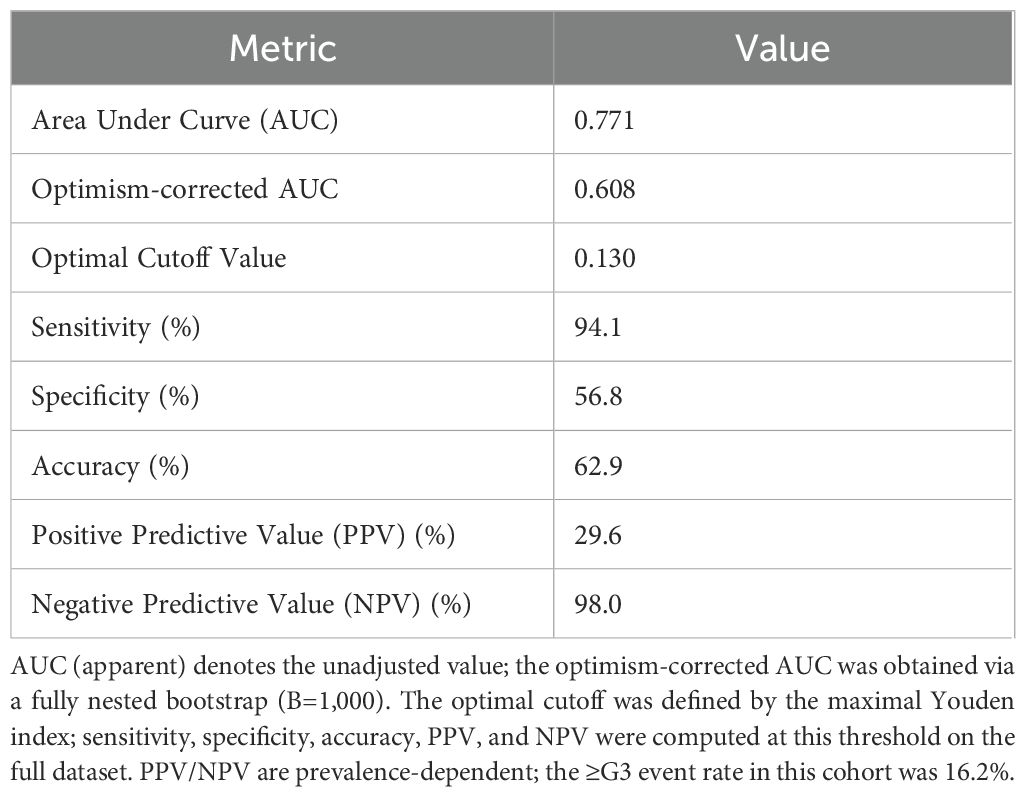 Under the apparent fit, the model demonstrated good discrimination (AUC=0.771) and a low probabilistic error (Brier = 0.114). Following internal validation with a fully nested bootstrap (B=1,000) and optimism correction, discrimination declined to AUC=0.608 (95% CI 0.464–0.761), with a corresponding Brier score of 0.176 (95% CI 0.114–0.247), indicating some overfitting in the context of few events yet an overall moderate discriminative capacity. For clinical interpretability, summary metrics are reported in Table 2, including both the apparent AUC and the optimism-corrected AUC derived from the fully nested bootstrap (B=1,000). The optimal threshold determined by the maximal Youden index was 0.130; at this cutoff, sensitivity was 94.1%, specificity 56.8%, accuracy 62.9%, PPV 29.6%, and NPV 98.0%. Given the low event rate of ≥G3 in this cohort, the model offers strong rule-out performance (high NPV), supporting early alerting and intensified follow-up for patients at elevated risk. The ROC curve is shown in Figure 2.