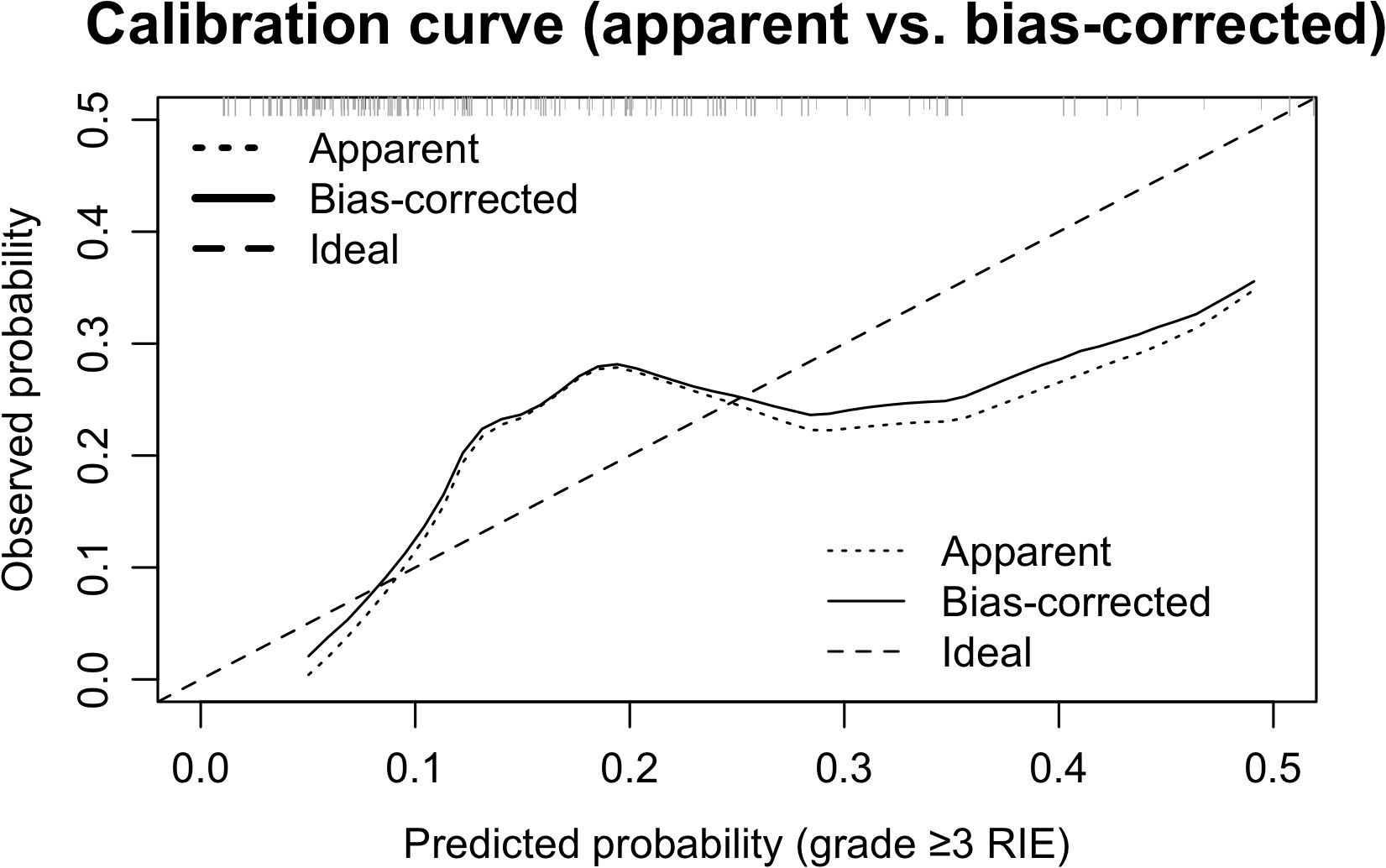 This single-center retrospective cohort adhered to TRIPOD. Given the limited number of events (≥G3, 16.2%), we did not split the data into training and validation sets; instead, internal validation employed a fully nested bootstrap (B=1,000) to obtain robust performance estimates and optimism correction.