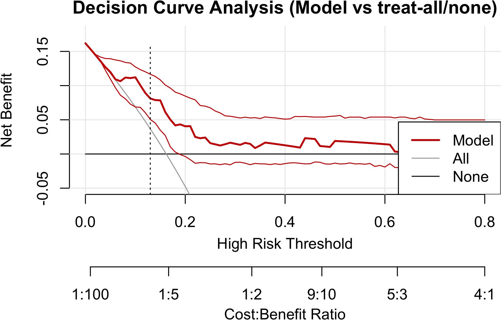 Using the rmda framework, DCA was performed across threshold probabilities of 0–0.80 with 500 bootstrap resamples (Figure 4). Within commonly used clinical thresholds, the model’s curve lay consistently above the “treat-all” and “treat-none” baselines: between ~0.05 and 0.35, the model conferred sustained positive net benefit, indicating that model-guided intervention outperforms either extreme strategy. As thresholds increased further, net benefit gradually approached the baselines. At the ROC-derived optimal threshold of pt ≈ 0.13 (maximal Youden index), the net benefit was ~0.03–0.04, equivalent to ≈3–4 net true positives per 100 patients—avoiding unnecessary interventions without increasing missed cases. Collectively, the model yields tangible clinical gain across low-to-moderate thresholds, supporting its use for early alerting and intensified follow-up in high-risk patients.