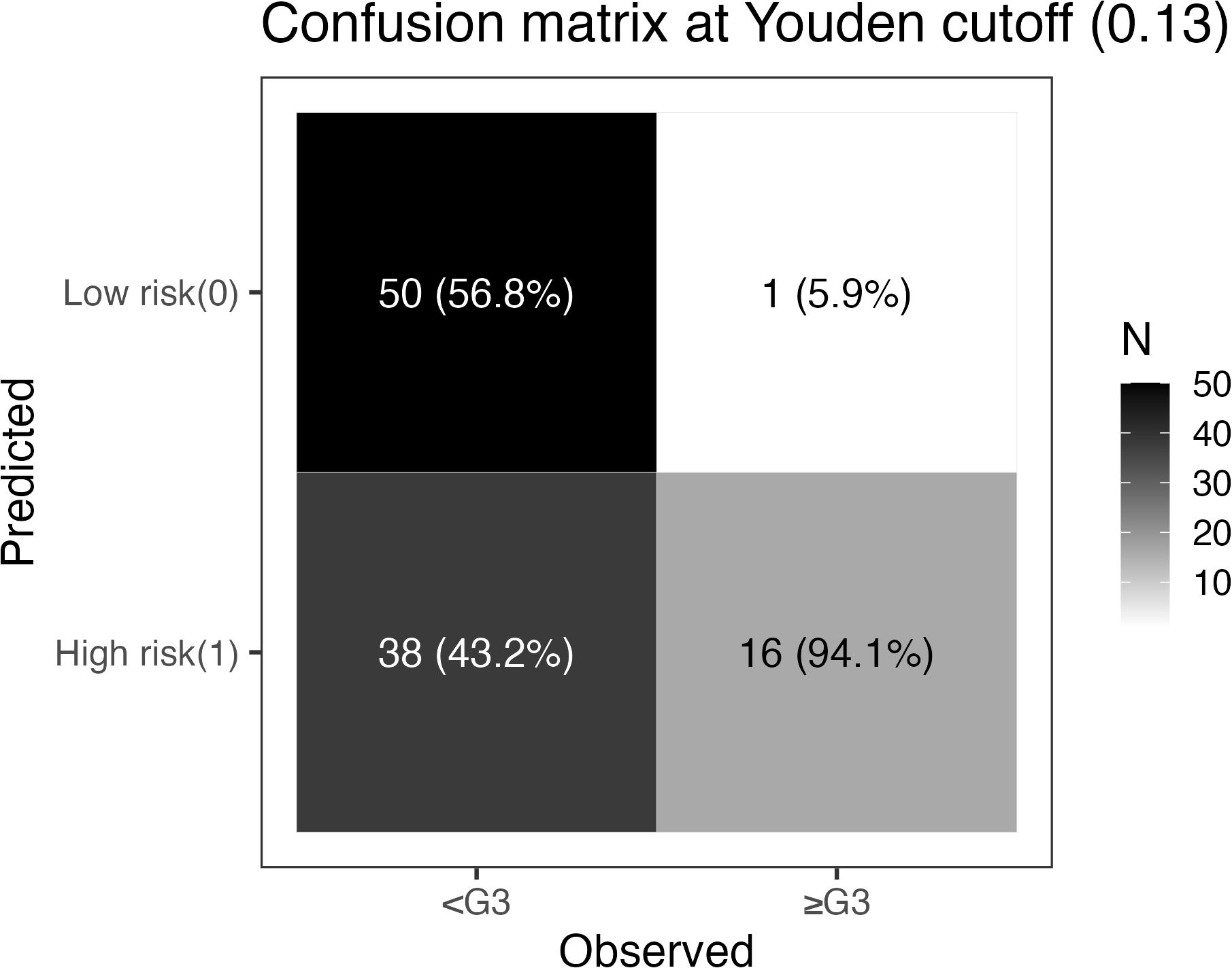 Figure 5. Confusion matrix at the Youden threshold (pt = 0.13). Rows indicate model predictions (top: low risk [0]; bottom: high risk [1]); columns indicate observed outcomes (left: no ≥G3 RIE; right: ≥G3 RIE). Each cell shows counts, with column percentages in parentheses (proportion within the observed-outcome column): TN=50 (56.8%), FN=1 (5.9%), FP=38 (43.2%), TP=16 (94.1%). Derived metrics: sensitivity 94.1%, specificity 56.8%, accuracy 62.9%, PPV 29.6%, NPV 98.0%. The grayscale bar on the right encodes count magnitude.