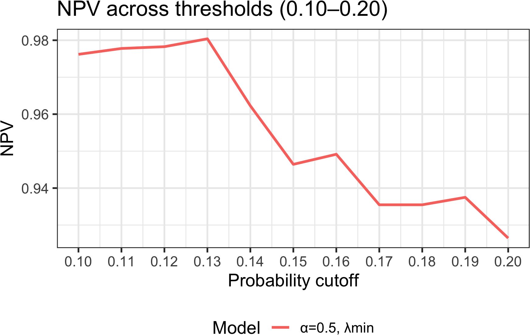 Figure 7. Threshold sensitivity analysis: NPV across probability thresholds (0.10–0.20). NPV–threshold curves derived from the final model (elastic-net α = 0.5, λ_min). NPV is stable at 97.5%–98.0% between 0.10 and 0.13, with a peak at 0.13 (~98.0%); at thresholds ≥0.15, NPV declines to 93.5%–94.6%. Together with the optimal cutoff 0.13 (sensitivity 94.1%, specificity 56.8%, PPV 29.6%, NPV 98.0%), the model demonstrates superior performance for ruling out ≥G3 RIE, enabling patients with predicted probability <0.13 to be classified as low risk for streamlined follow-up and resource allocation.