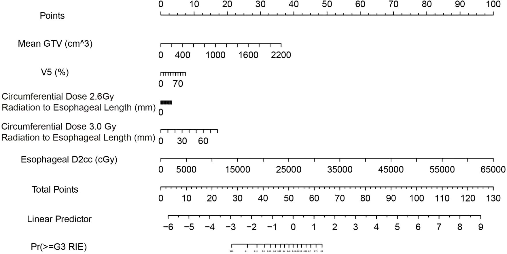 At the Youden-optimal threshold of 0.13, overall accuracy was 62.9%; sensitivity, 94.1%; specificity, 56.8%; NPV, 98.0%; and PPV, 29.6%. The high NPV indicates strong rule-out capacity for non-severe RIE, potentially reducing unnecessary pre-treatment interventions, while the high sensitivity favors comprehensive capture of high-risk individuals to support risk stratification and clinical decision-making. Decision-curve analysis showed positive net benefit across commonly used thresholds (~0.05–0.60). The nomogram is concise and intuitive, enabling rapid estimation of an individual’s probability of grade ≥3 RIE from five key dosimetric/geometric factors, thereby facilitating plan optimization and clinician–patient communication.